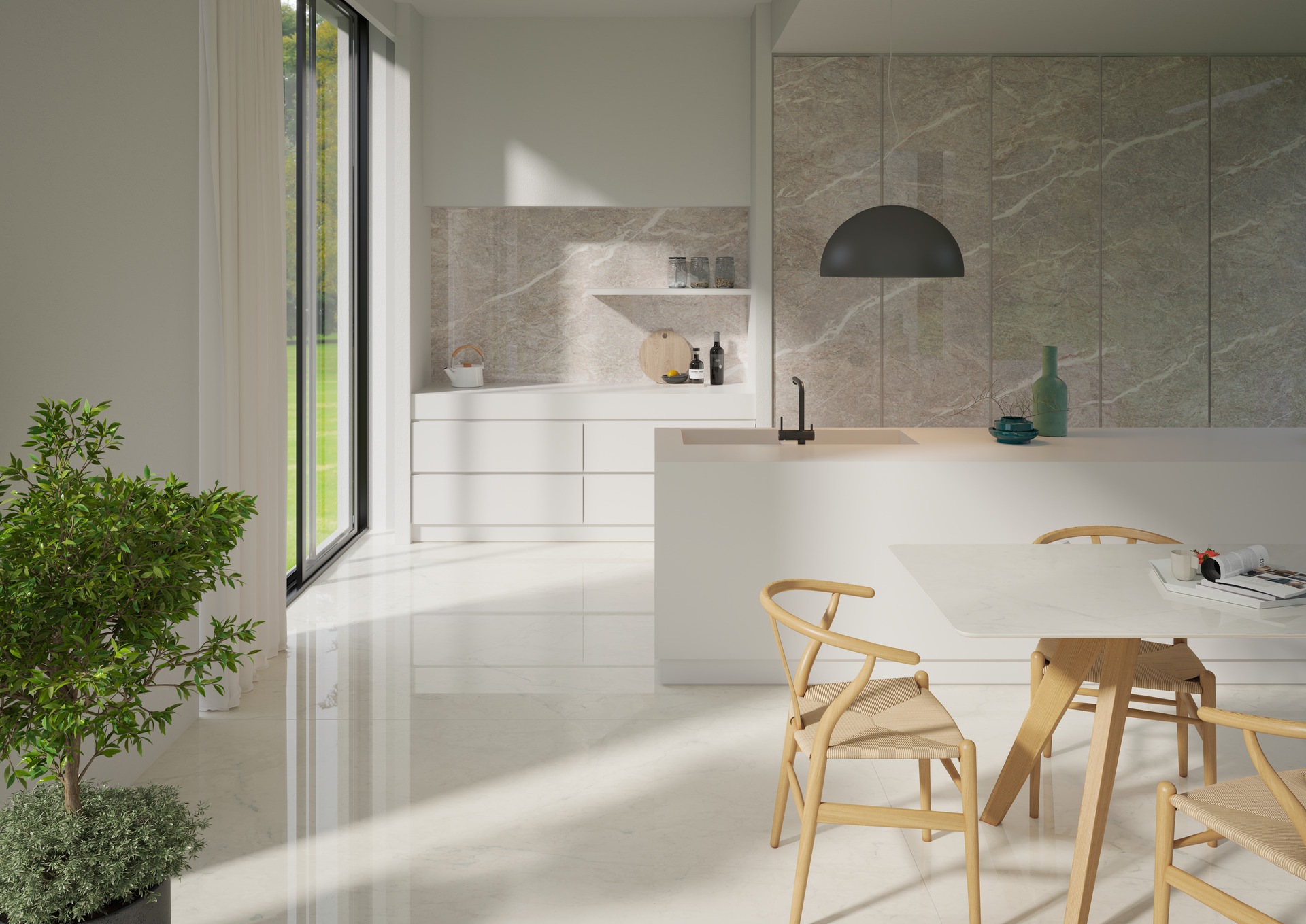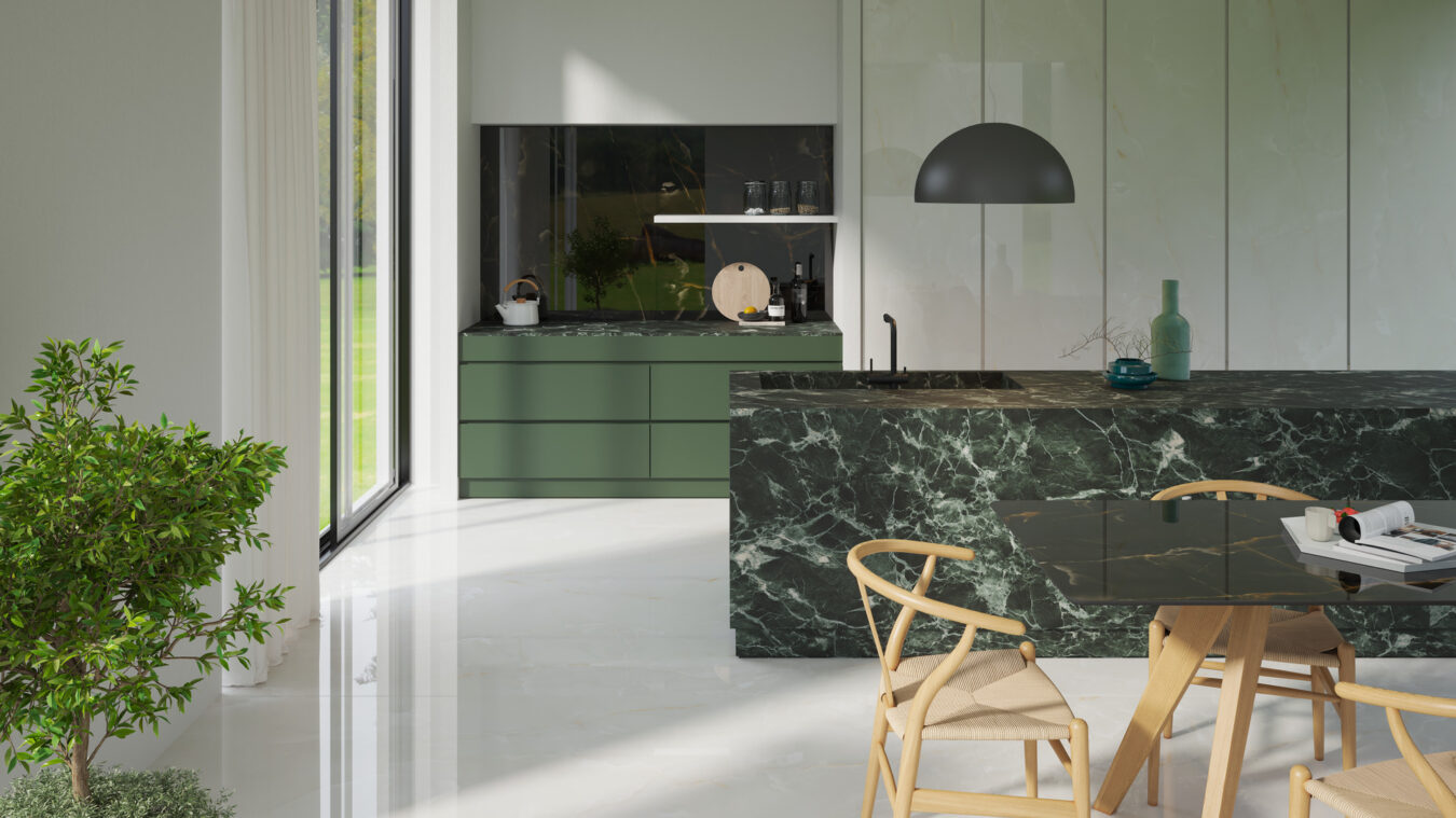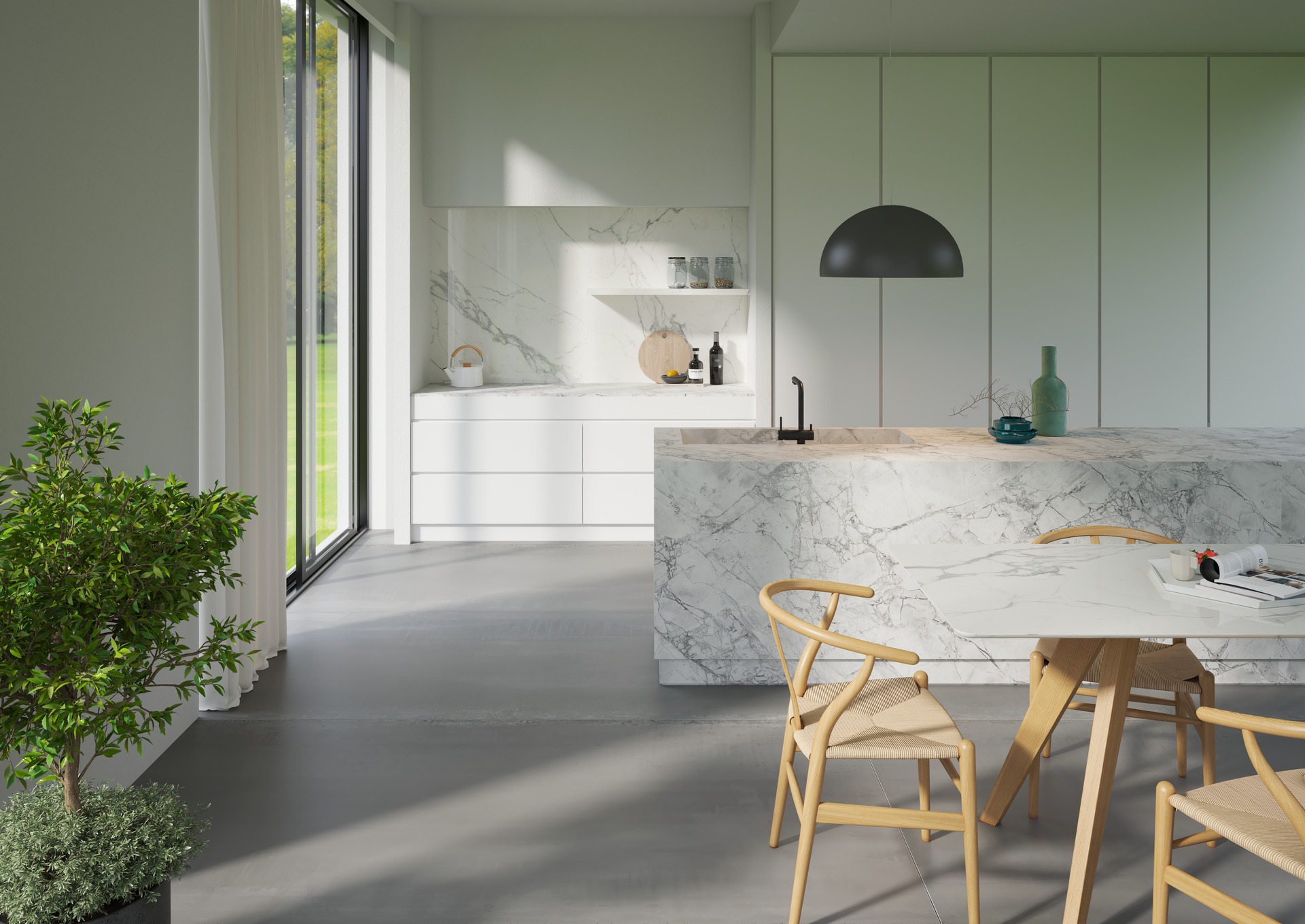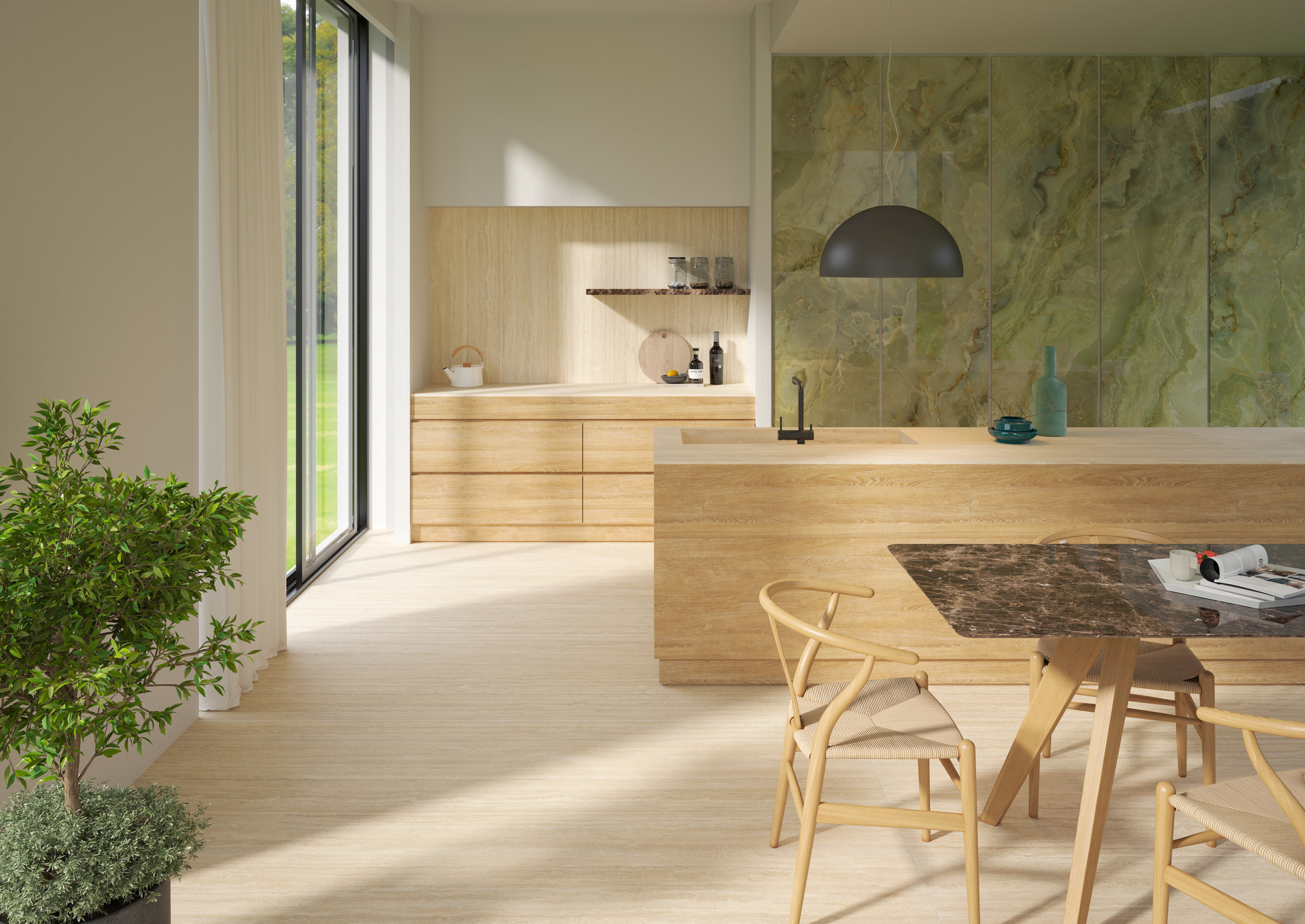 Les dalles grand format de Marazzi The Top soulignent l’importante présence décorative du grès cérame. Applicables des plans de travail aux crédences des zones de travail, des tables aux revêtements verticaux des meubles de rangement, les collections permettent de créer des solutions d’ameublement sur mesure aux multiples personnalités : par exemple, on peut associer l’étonnante fidélité des détails de Wood Look à la texture chaude et poreuse du travertin ou encore aux veines dessinées et ombrées des précieux marbres polychromes, créant ainsi des revêtements verticaux à l’aspect vibrant. Le choix d’effets marbre plus traditionnels, comme Statuario ou Calacatta, permet d’inscrire la tradition dans des cadres contemporains plus minimalistes.
