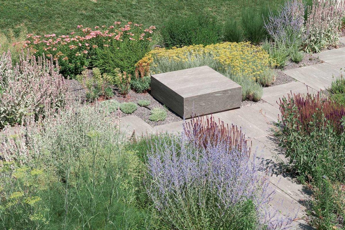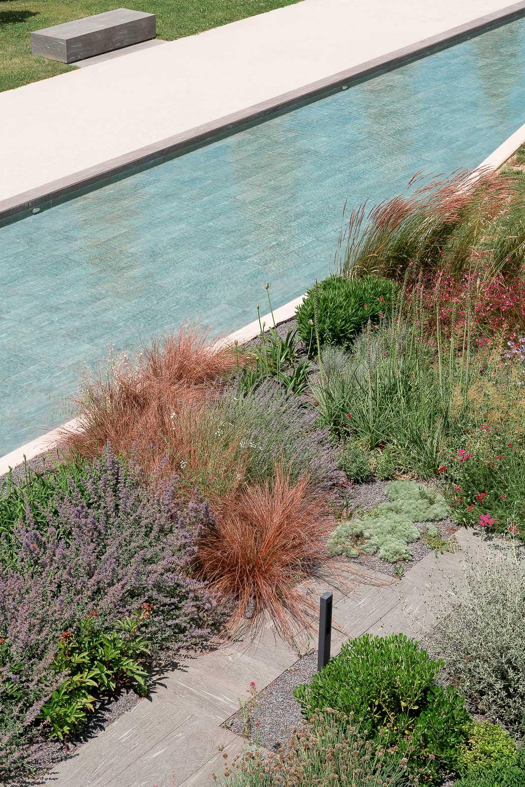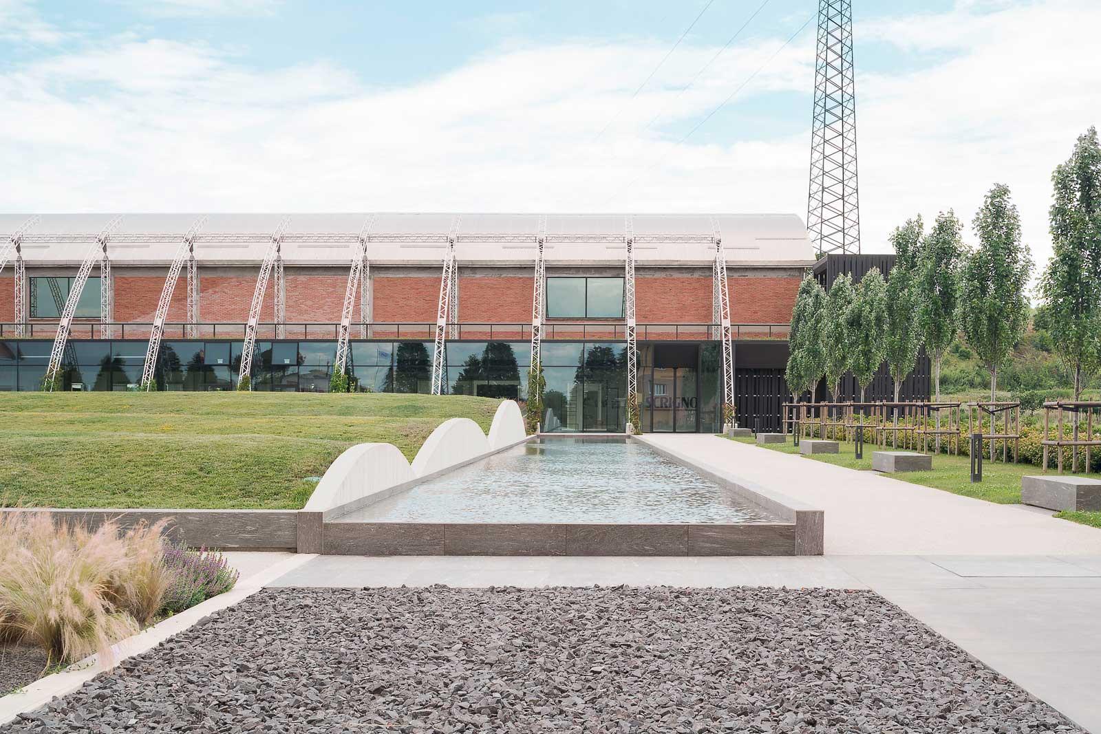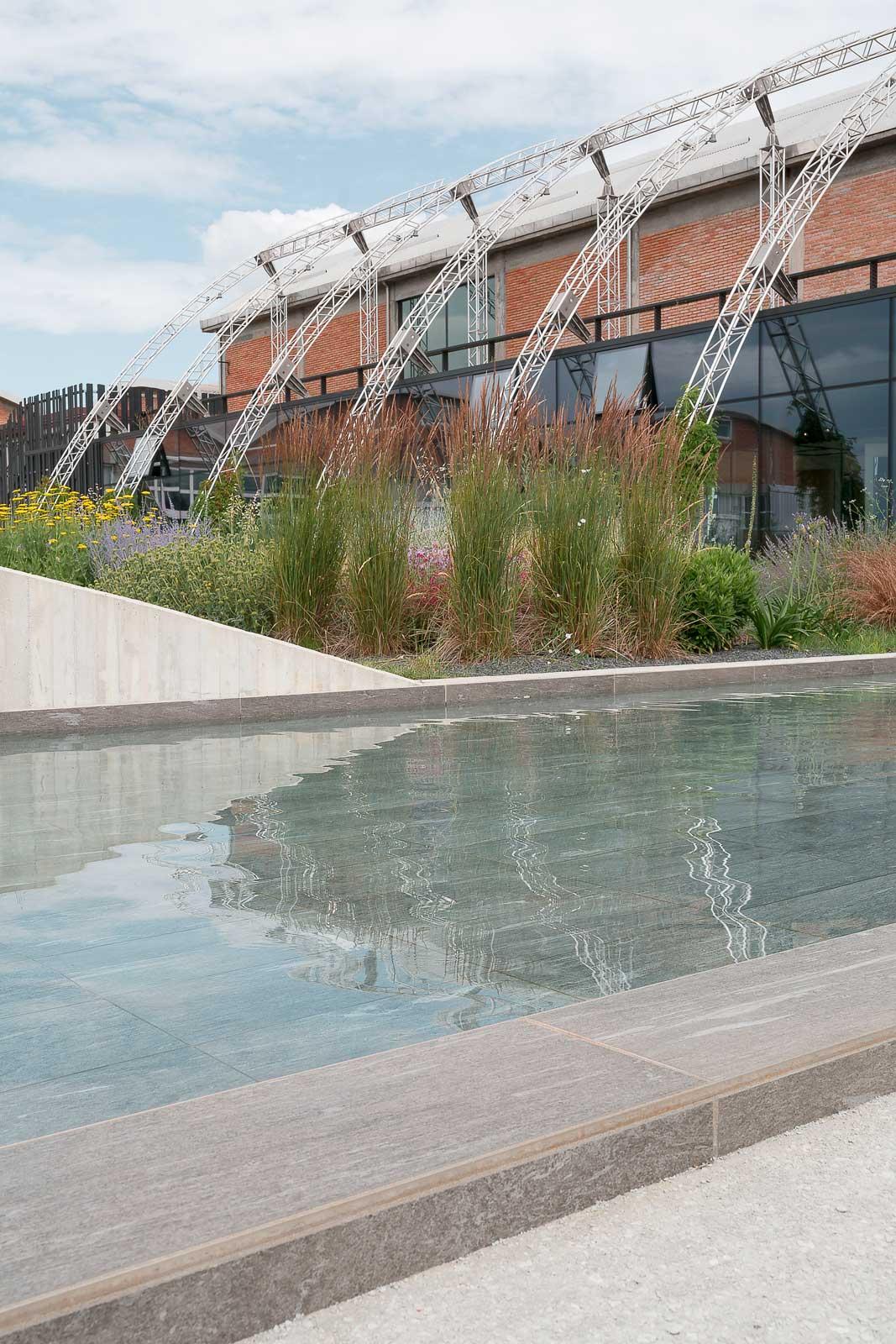 Le bassin rectiligne, élément clou du projet, rythmé par une rangée de peupliers blancs, se termine par un saut dans le vide, où l'eau s'écoule pour disparaître dans le sol qui devient un lit de galets. Trois grandes dunes d'herbe rappellent les terrains à cultiver, tout en faisant un clin d'œil à la toiture courbe des établissements industriels. Entre la façade en verre teinté du showroom et la dune la plus haute, s'insinue un jardin secret, non visible depuis l'entrée, où se rendre pendant les pauses pour y trouver un peu de repos et de relax.