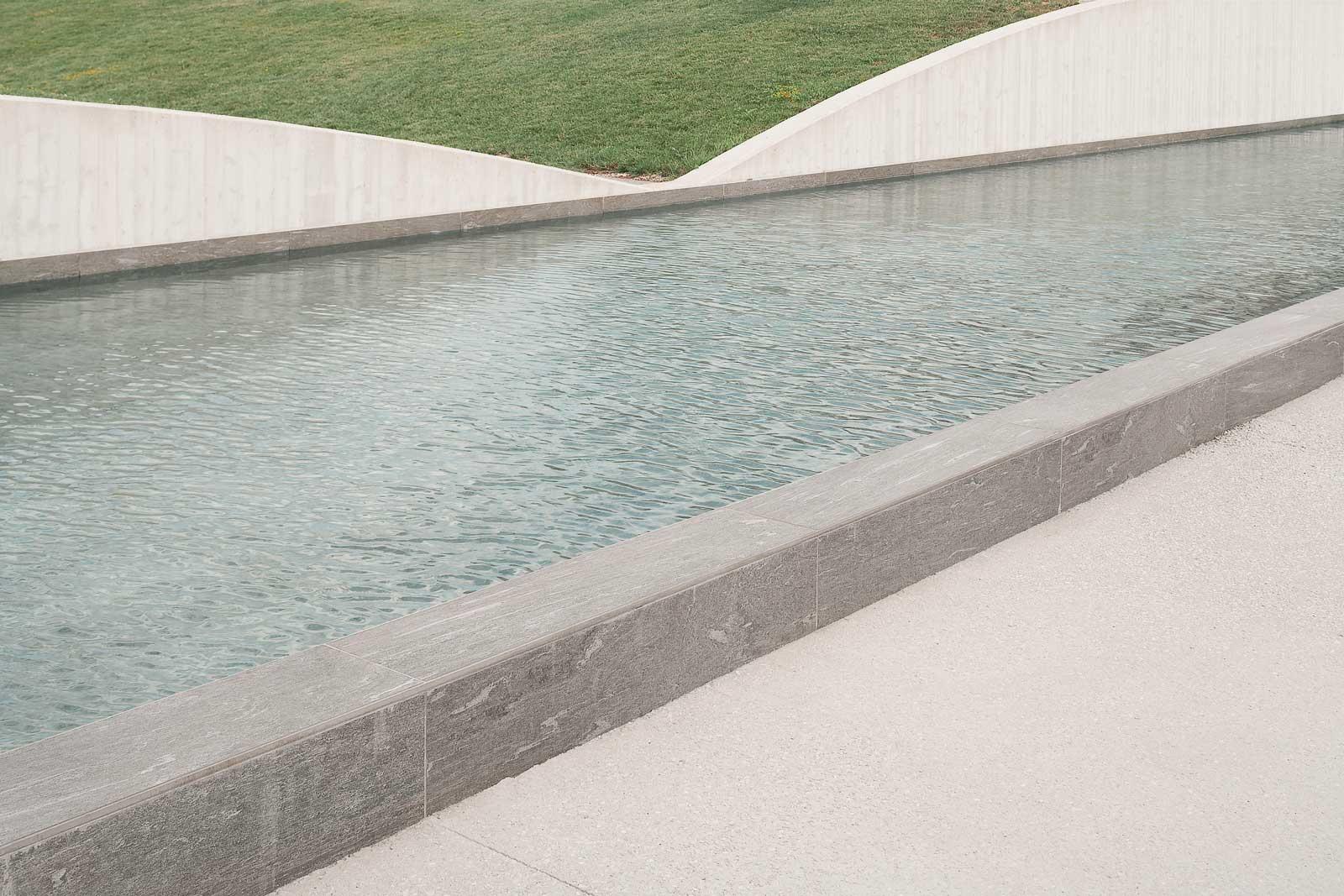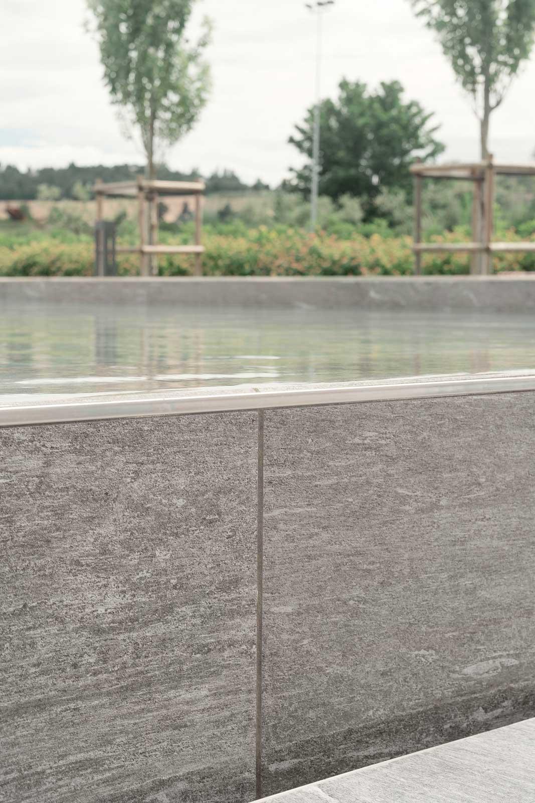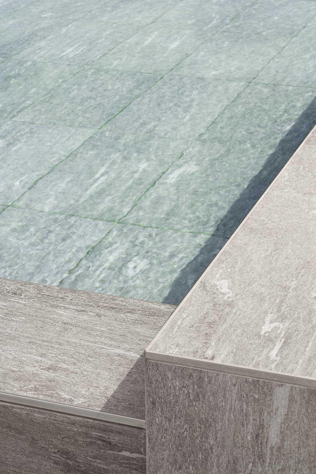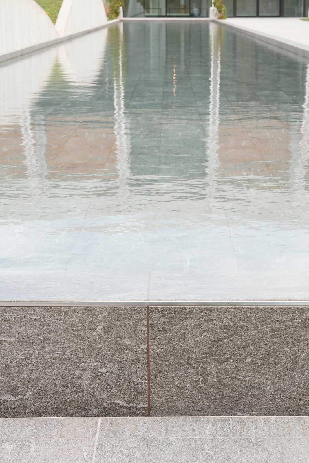 La collection Pietra di Vals Marazzi, un grès cérame inspiré des quartzites les plus rares, choisi en anthracite, instaure un dialogue parfait, tant en intérieur qu'en extérieur, avec les éléments naturels et avec les autres matériaux sélectionnés par les architectes. Le grès 60×120 cm accompagne dans son voyage le visiteur qui le retrouve non seulement sur le sol de la terrasse et du bassin ornemental, mais aussi sur les assises, les volumes, les murs du bassin et la rampe de la terrasse en version 2 cm.