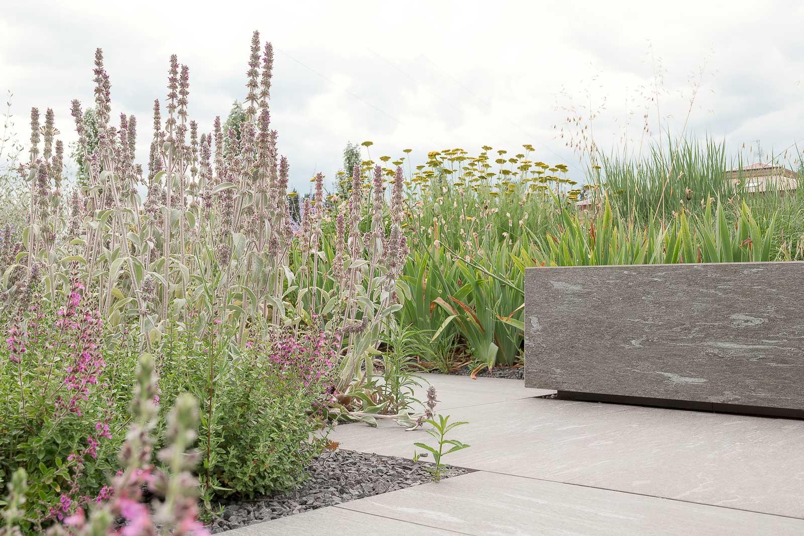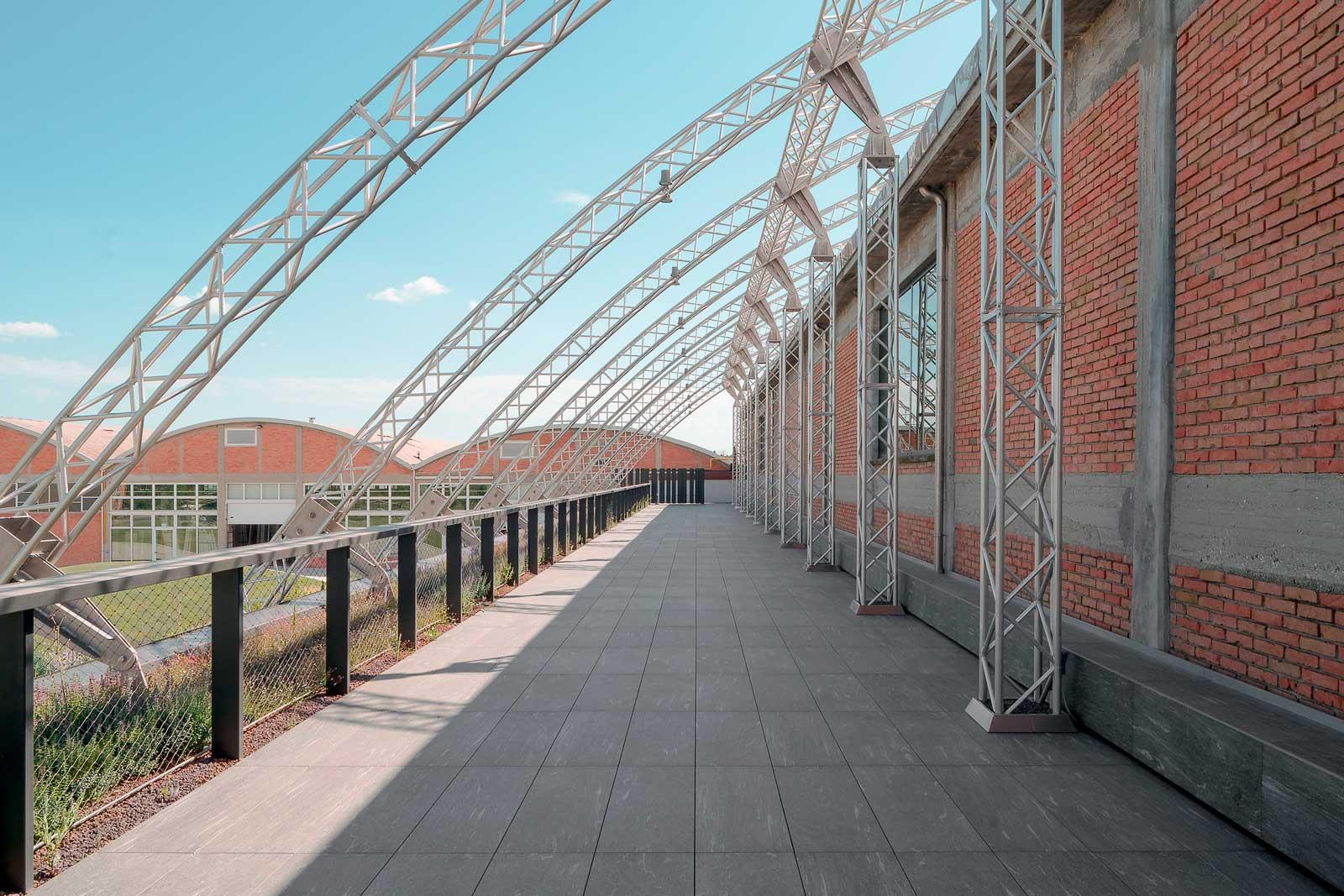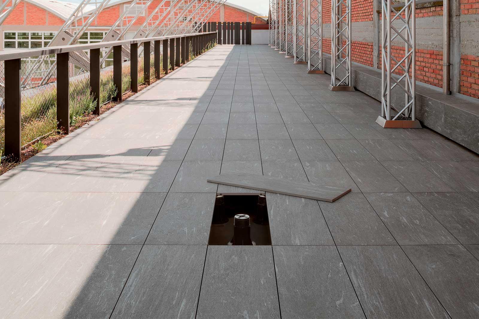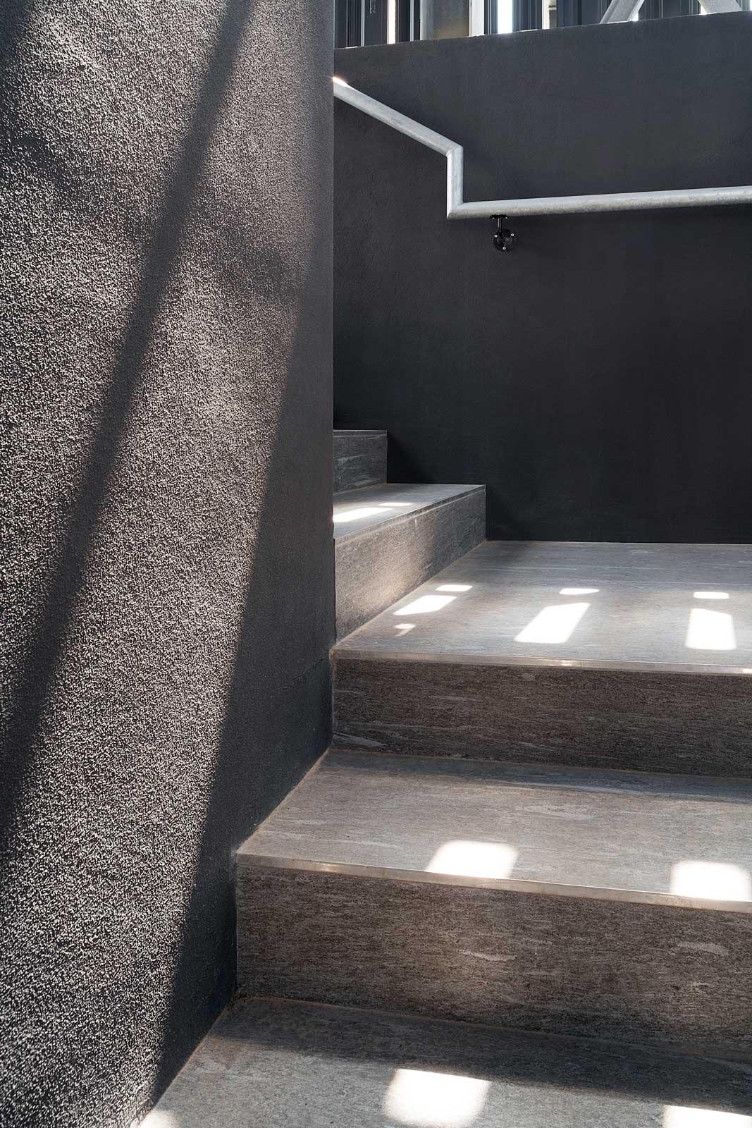 La collection Pietra di Vals Marazzi, un grès cérame inspiré des quartzites les plus rares, choisi en anthracite, instaure un dialogue parfait, tant en intérieur qu'en extérieur, avec les éléments naturels et avec les autres matériaux sélectionnés par les architectes. Le grès 60×120 cm accompagne dans son voyage le visiteur qui le retrouve non seulement sur le sol de la terrasse et du bassin ornemental, mais aussi sur les assises, les volumes, les murs du bassin et la rampe de la terrasse en version 2 cm.