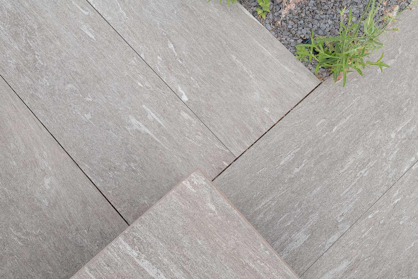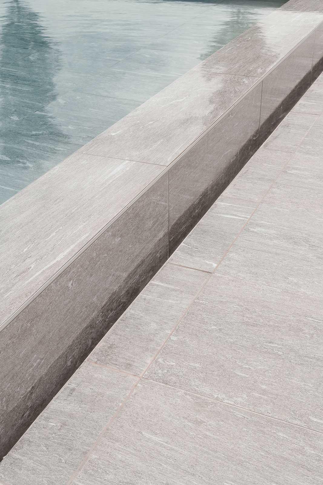La solidité esthétique de l'imitation pierre s'allie à la ductilité technique et fonctionnelle du grès à travers des découpes et des raccords de pose qui expriment tout le potentiel de cette matière en décoration extérieure.