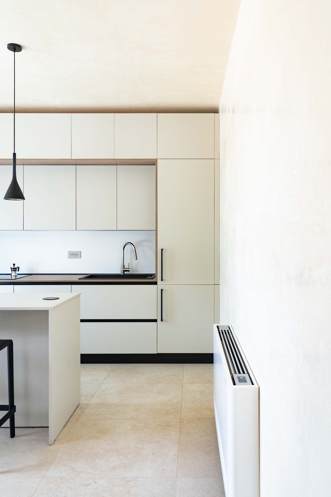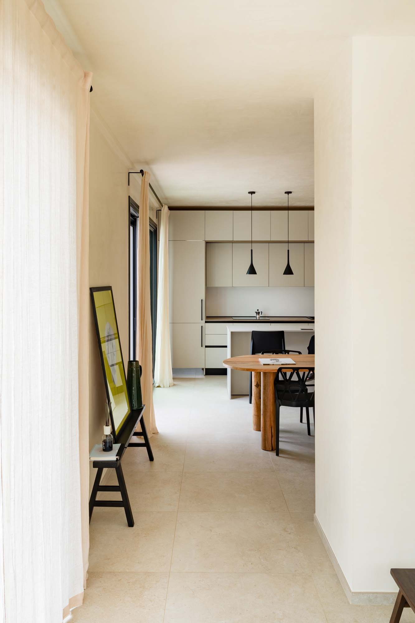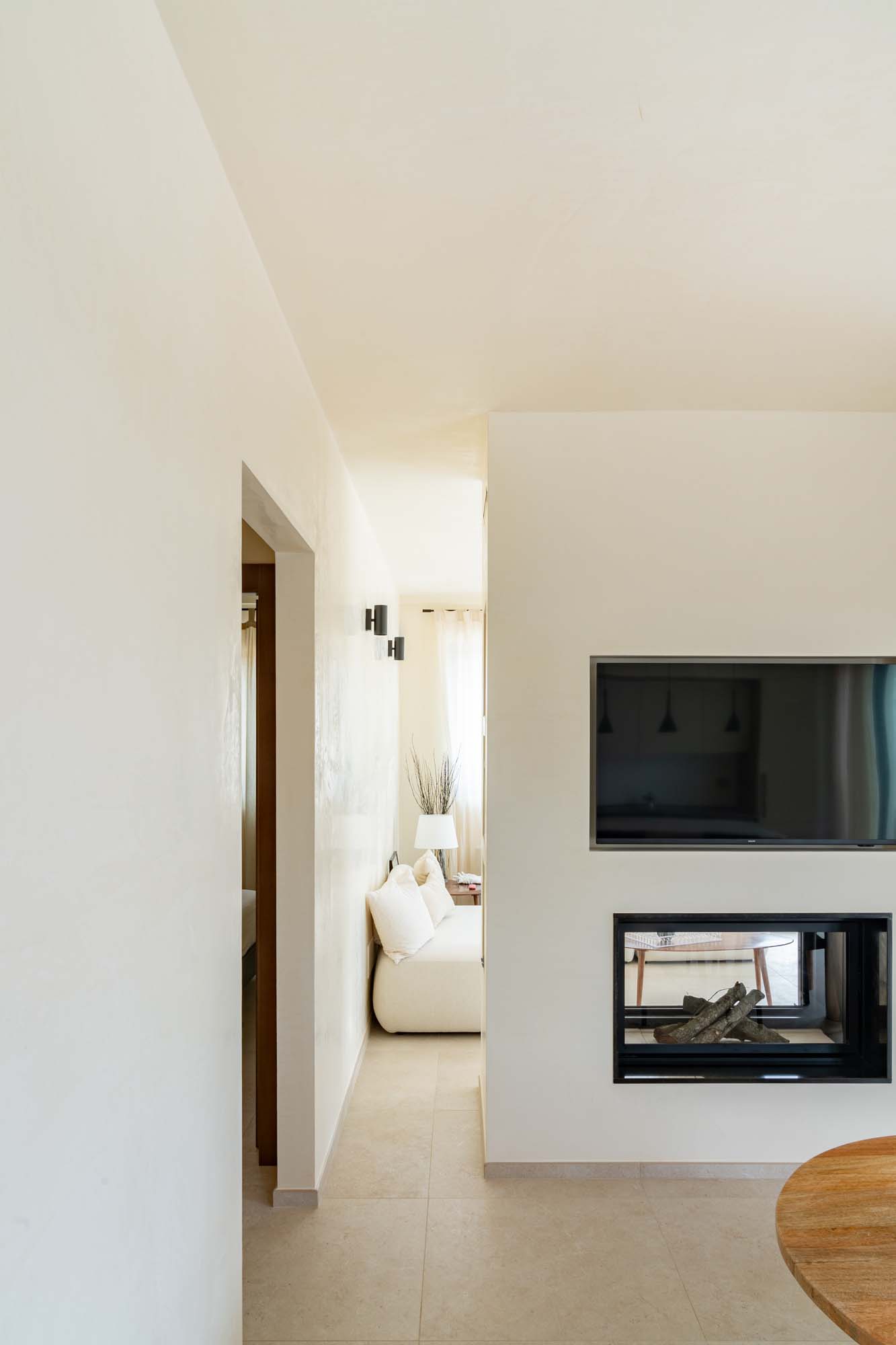 Le choix des matériaux a été déterminant dans la réussite du projet. Pour les sols de toute la maison, Mara Prezioso a opté pour les céramiques Marazzi, en l'occurrence la lumineuse couleur Ivory du grès cérame imitation pierre Mystone Limestone. Ce produit a été sélectionné pour sa capacité à souligner le contraste entre l'aspect rustique des trulli et la modernité des intérieurs. Avec ses tons chauds et naturels, la collection Mystone Limestone se marie parfaitement aux murs en pierre et aux éléments en bois, créant ainsi une ambiance chaleureuse et raffinée.