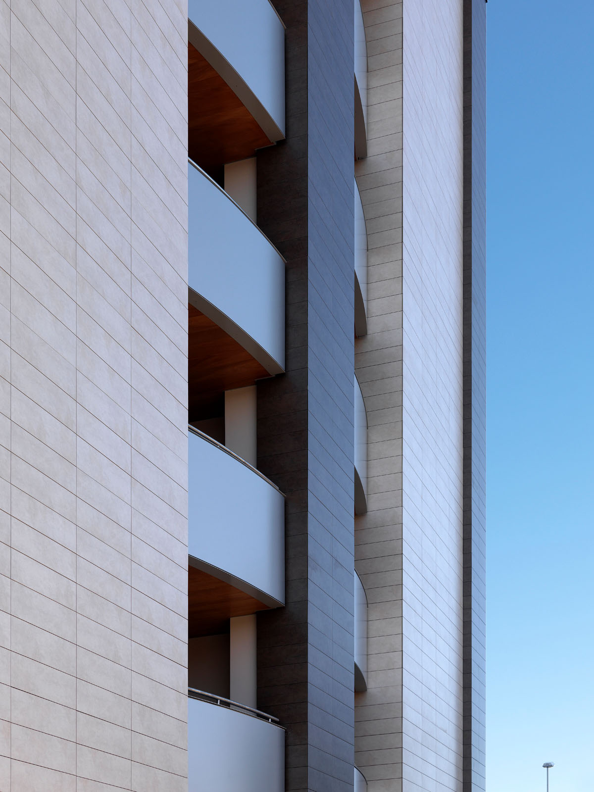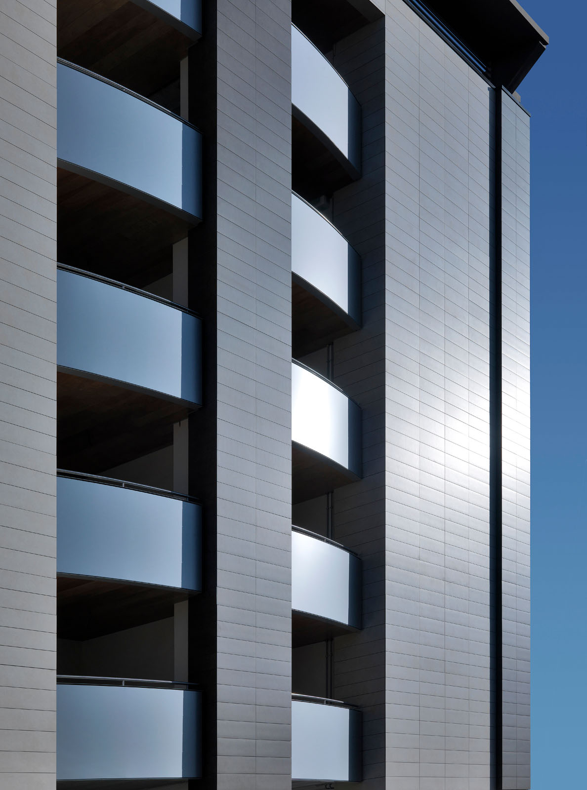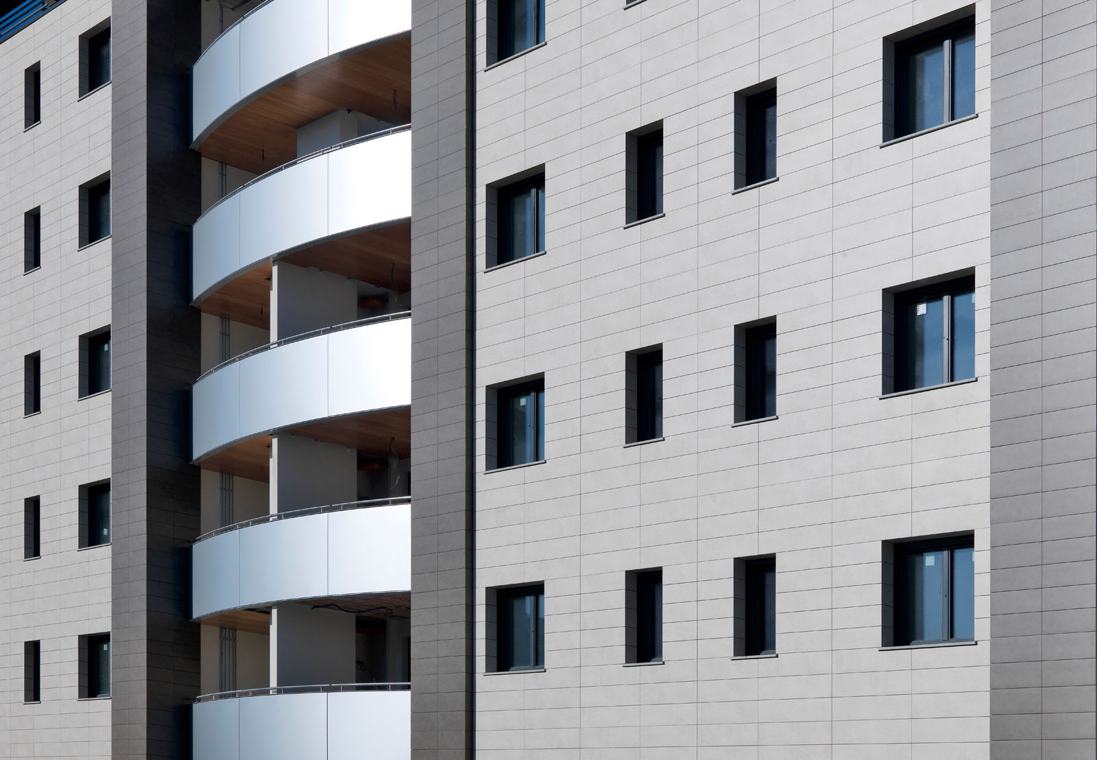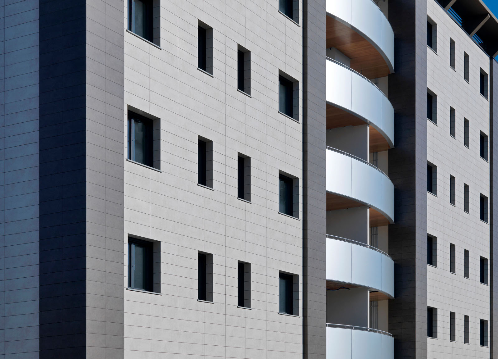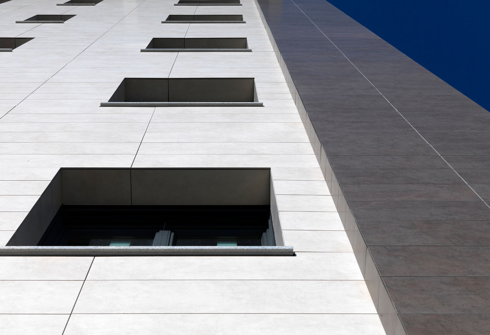 Dans le projet de ce grand ensemble, il n’était pas prévu au départ d’appliquer un revêtement extérieur de type façade ventilée. Pour exploiter correctement les avantages de cette technologie sans révolutionner l’aspect original de certains éléments réputés essentiels, il a été nécessaire d’établir un étroit lien de collaboration entre le concepteur, l’entreprise et le bureau d’étude technique de chez Marazzi Engineering. Ce dernier a su proposer des solutions appropriées à tous les problèmes, y compris ceux qui concernaient l’esthétique. La grande modularité géométrique aussi bien verticale qu’horizontale pouvait créer des problèmes d’adaptation aux formats céramiques, à moins d’introduire des éléments de compensation qui cependant auraient brisé la continuité modulaire du revêtement. C’est la raison pour laquelle il semblait plus juste d’utiliser des dalles de pierre dont les formats seraient modulés en fonction des différentes dimensions des façades ; une solution contrastée par le client qui voulait donner à cet ensemble une touche de modernité plus appuyée. C’est la raison pour laquelle le choix est tombé sur le grès cérame Stone-Collection en deux tonalités, une claire et une foncée, dans un format horizontal qui a su pleinement satisfaire les attentes esthétiques tout en respectant les éléments architectoniques du projet et en garantissant dans le même temps l’uniformité modulaire du revêtement.