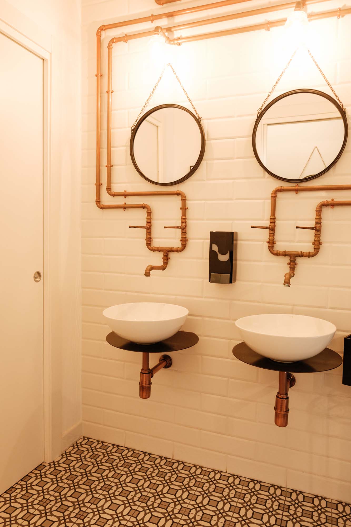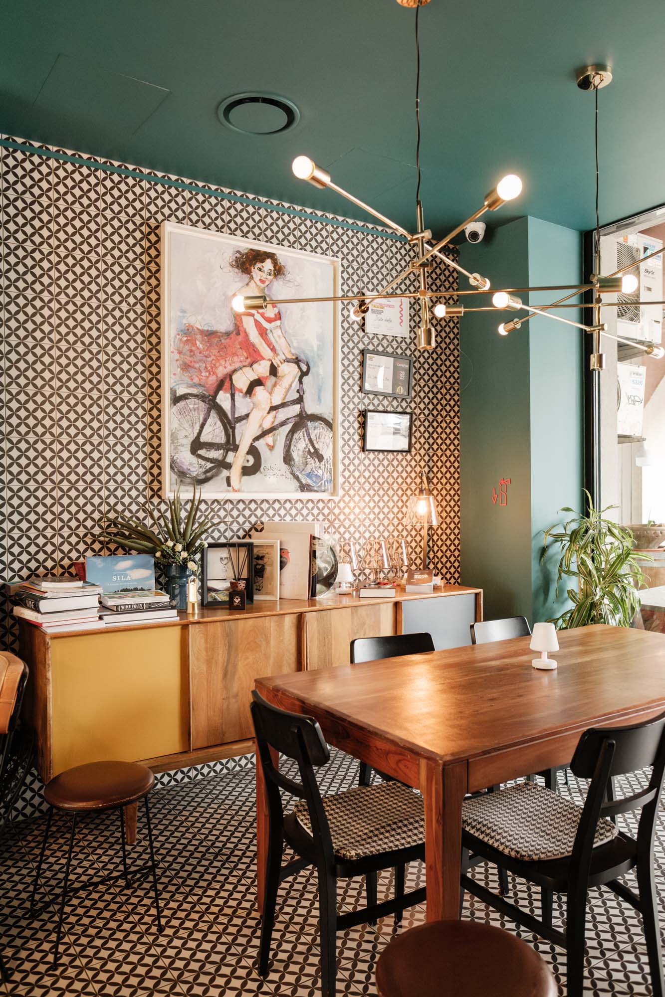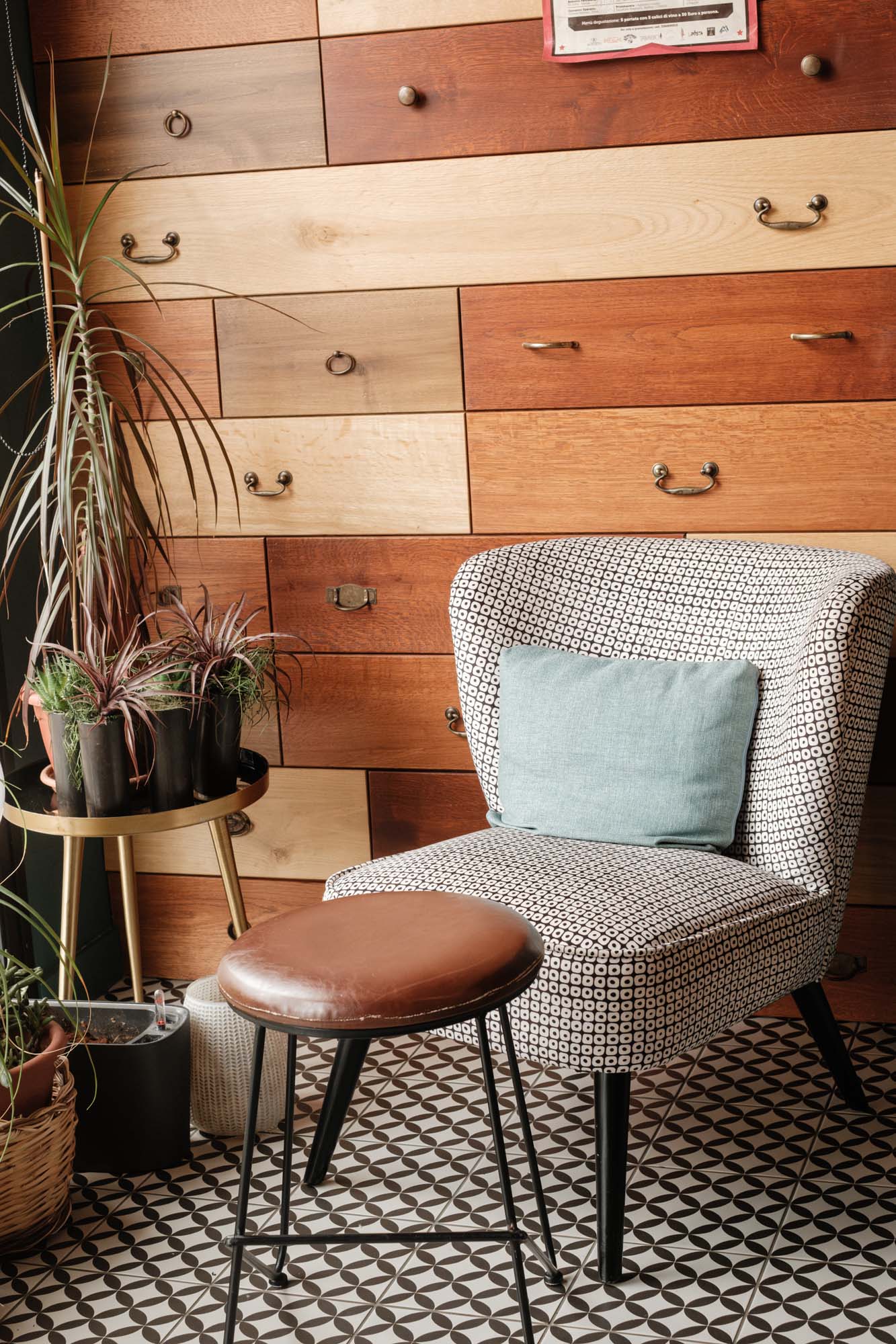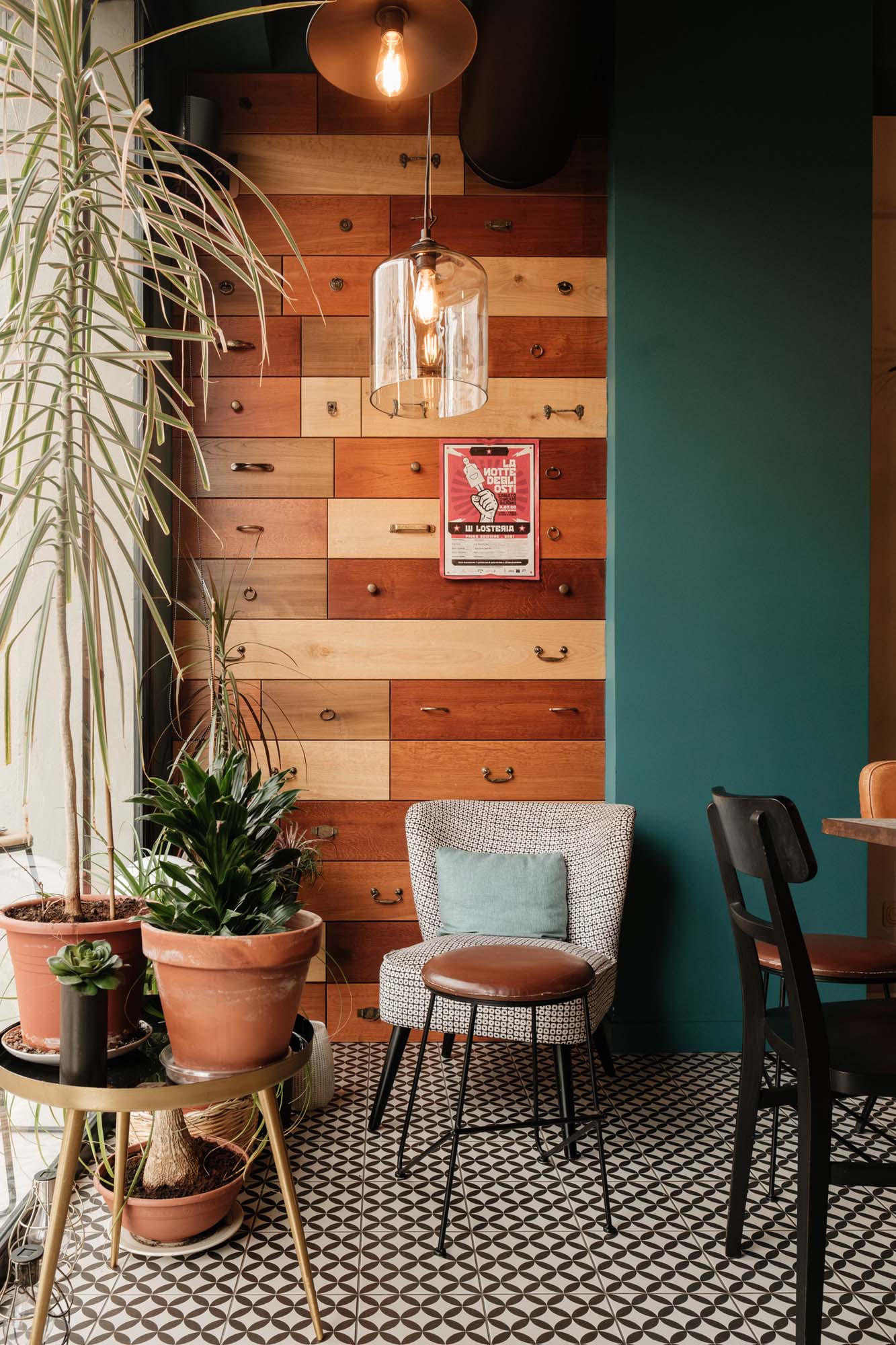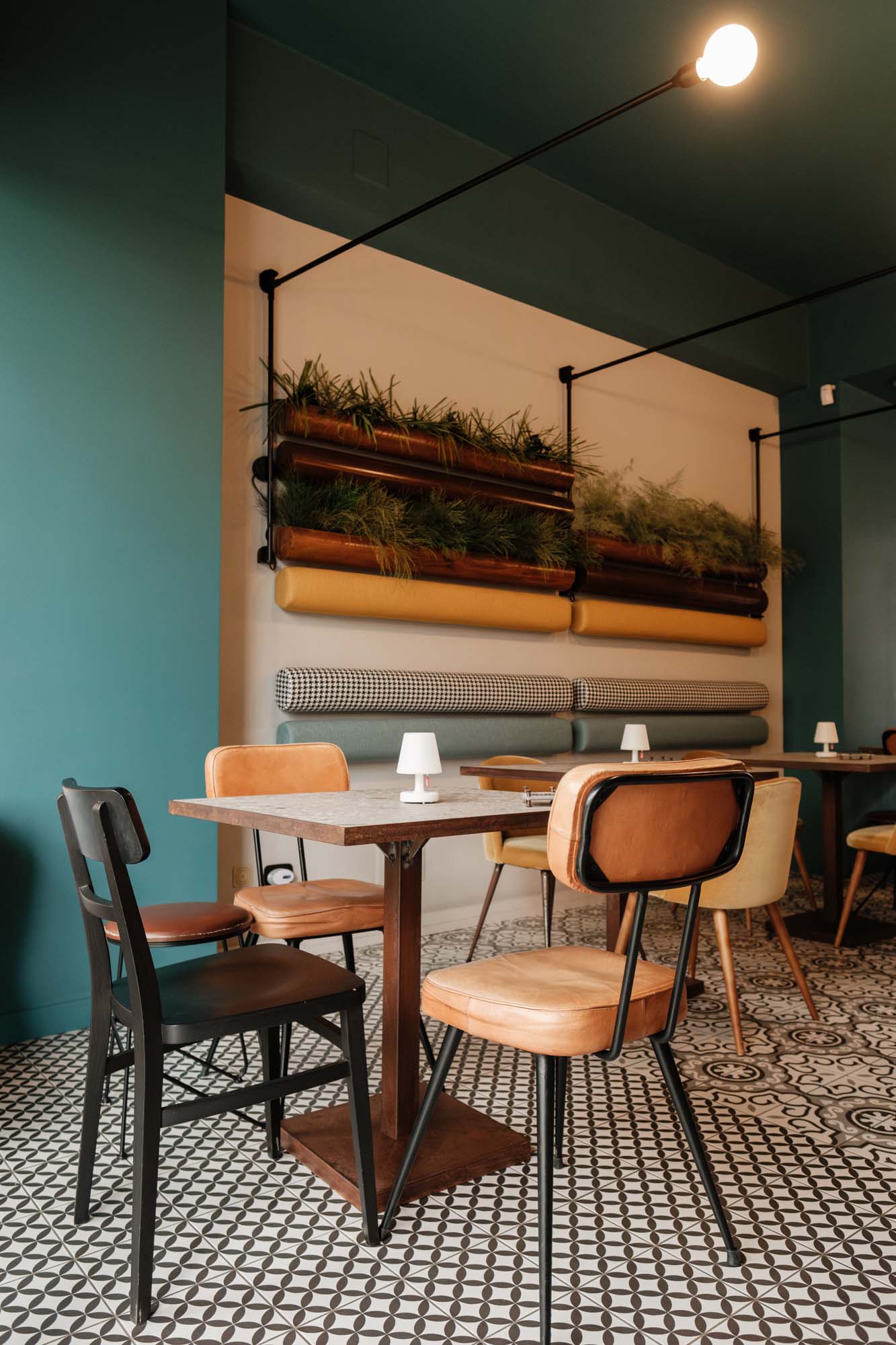 La collection D_Segni, au caractère rétro, s'inscrit parfaitement dans l'ambiance de l'espace, et le changement de décors Tappeto circonscrit et rythme l'extension longitudinale du restaurant. Chaque partie est une sorte d'alcôve chaleureuse et accueillante, où l'on peut observer et apprécier les imperfections du mobilier vintage comme synonyme d'originalité. « La céramique m'a permis de créer des renvois à des éléments du passé comme les carreaux de ciment et les papiers peints pied-de-poule, mais d'une manière inédite et contemporaine » poursuit Giulia Brutto. Et comme j'aime aussi concevoir des meubles, l'imitation pierre de Ceppo di Gré sur les tables a apporté légèreté et raffinement. Nous avons voulu une décoration d'intérieur qui résiste à l'épreuve du temps. Et la céramique, surtout dans ce type de réalisation, offre de nombreux avantages : une vaste gamme de choix décoratifs, de formats et de couleurs, une plus grande durabilité et résistance par rapport à d'autres matériaux, le rapport favorable au niveau des coûts, qui n'est pas un aspect secondaire dans l'économie d'un projet. »