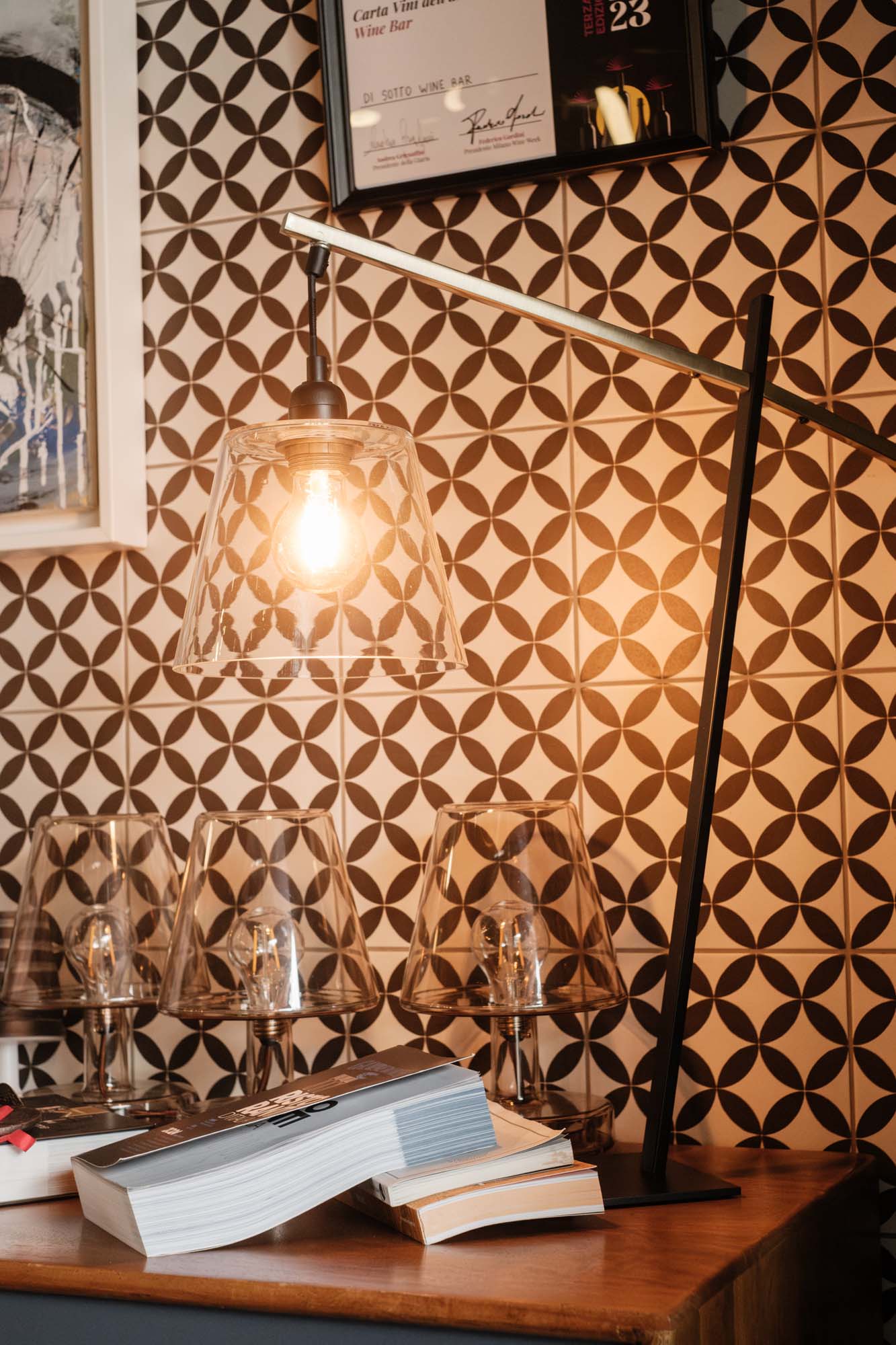Ambiance domestique et décorations qui évoquent une tradition intemporelle. Le bar à vin Di Sotto illustre une utilisation créative et polyvalente des collections Marazzi, à laquelle s'ajoutent les performances techniques de la céramique.