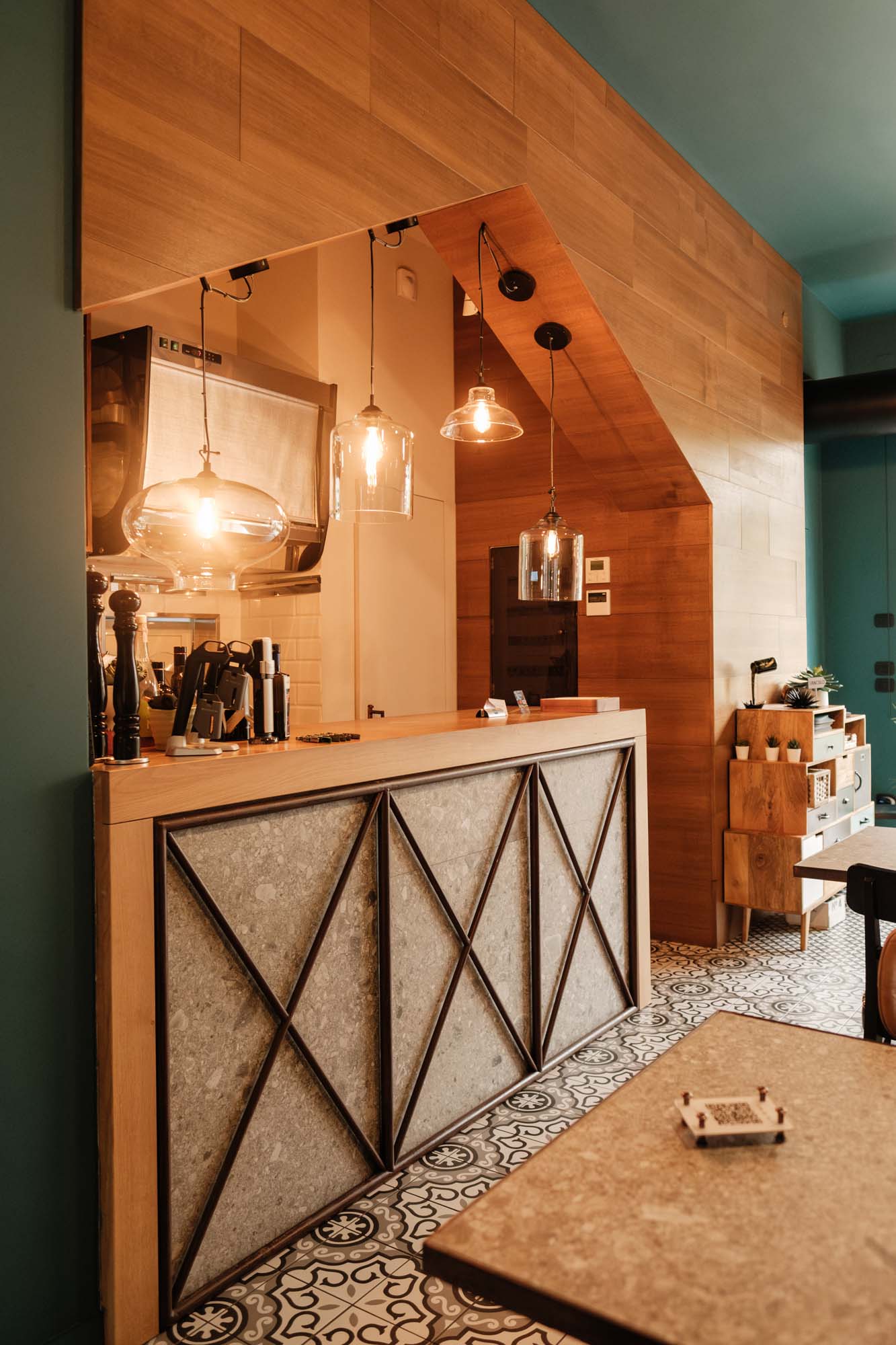 Le grès cérame de Marazzi a été largement utilisé dans le bar à vin Di Sotto, dans différents formats et éléments décoratifs. « Je suis partie du ton chaud du mobilier en bois, comme le comptoir et les éléments décoratifs muraux, pour créer un dialogue avec d'autres matières. J'ai choisi la collection de grès cérame Mystone Ceppo di Gré au format 75x75 cm pour le revêtement du comptoir et les plateaux des tables de la salle, à associer au fer en finition Corten pour créer un contraste entre les tons et textures des différents matériaux. Au sol et, en continuité, sur certains murs, j'ai utilisé la collection Crogiolo D_Segni dans les versions Tappeto Macro 2 et Tappeto Micro 3 au format 20x20 cm. Le choix recherche un équilibre entre des éléments hétérogènes pour créer une identité de lieu, reconnaissable au-delà des modes. La décoration rappelle notre tradition et ne perd pas sa valeur avec le passage du temps. »