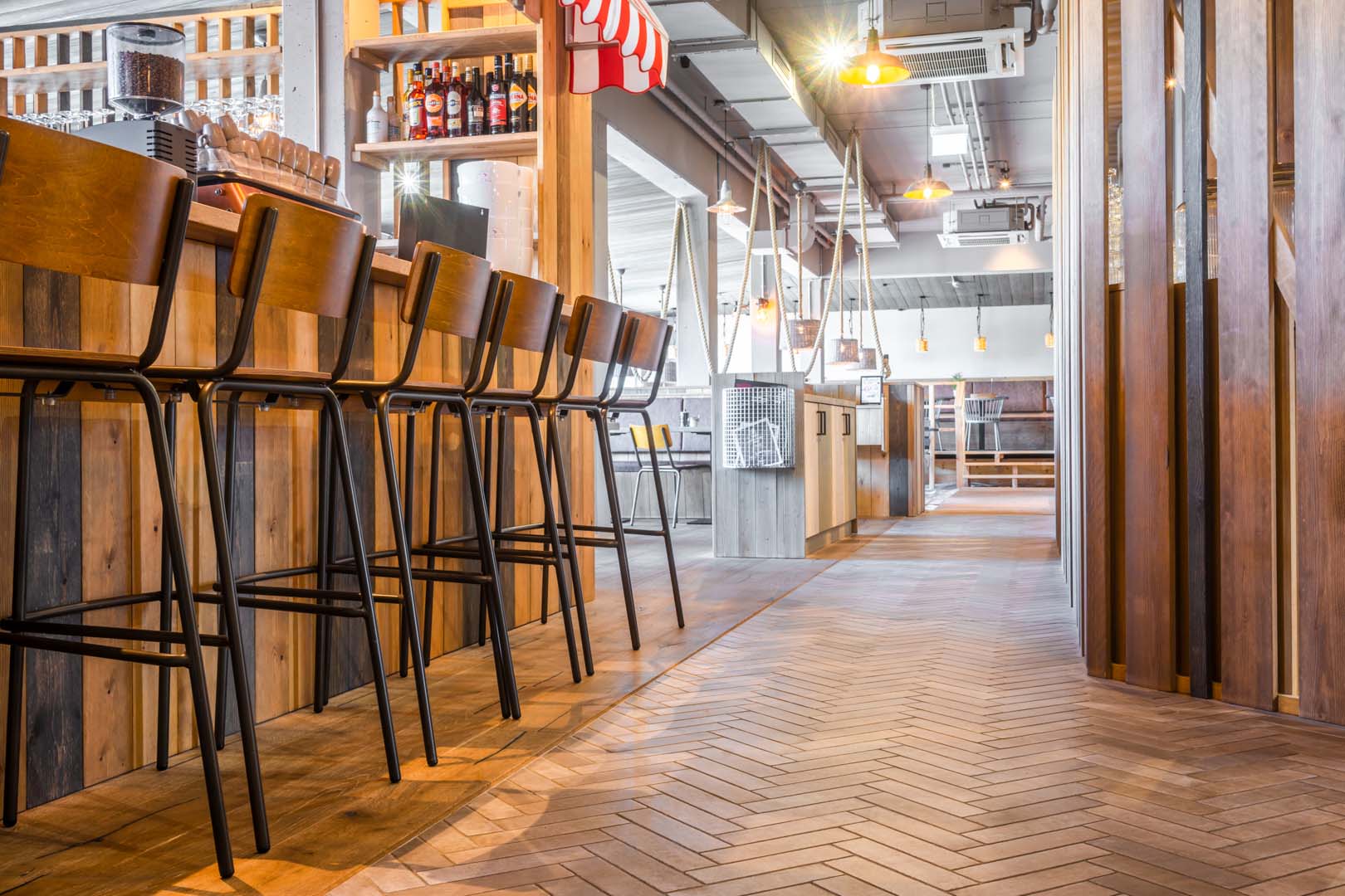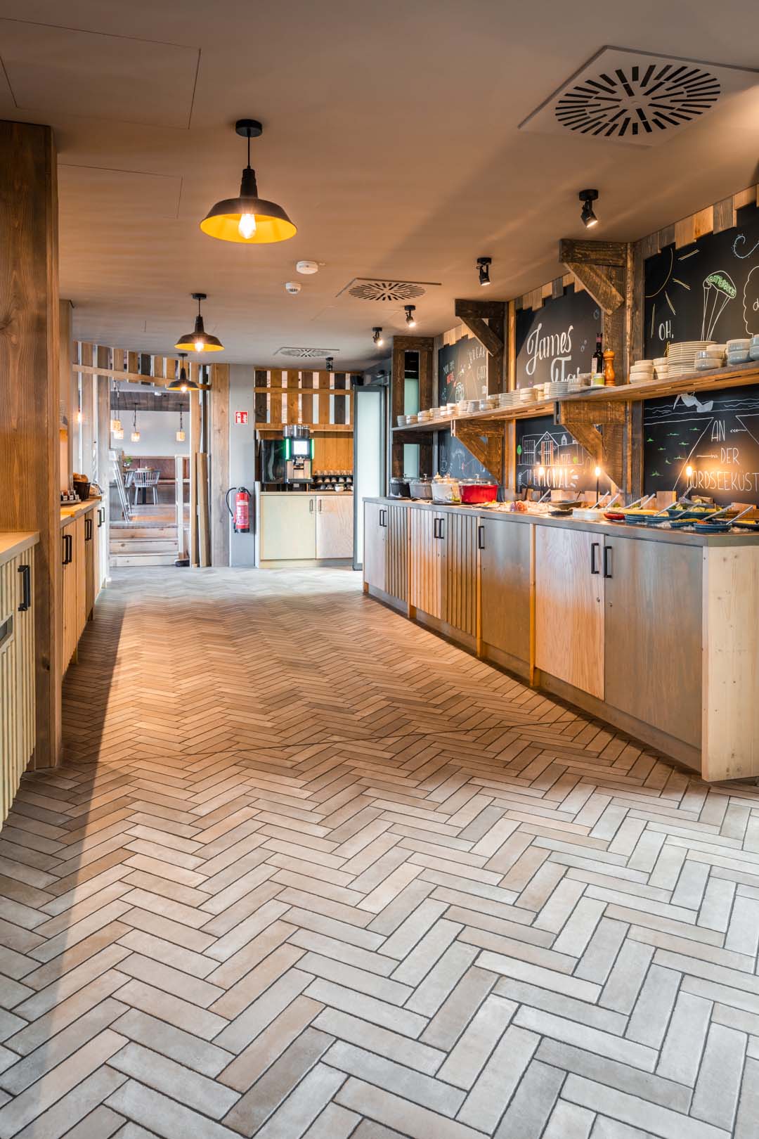 Avec ses 112 chambres et une position privilégiée sur le littoral de la mer du Nord, l'hôtel Bretterbude Büsum, petit dernier du groupe Heimathafen Hotels, se distingue par son design unique. Les architectes d'Architekturbüro Ladehoff GmbH ont largement recours à la céramique, et tout particulièrement aux séries Crogiolo Lume et Crogiolo Zellige, pour créer des aménagements industriels avec les collections Appeal et Terratech.