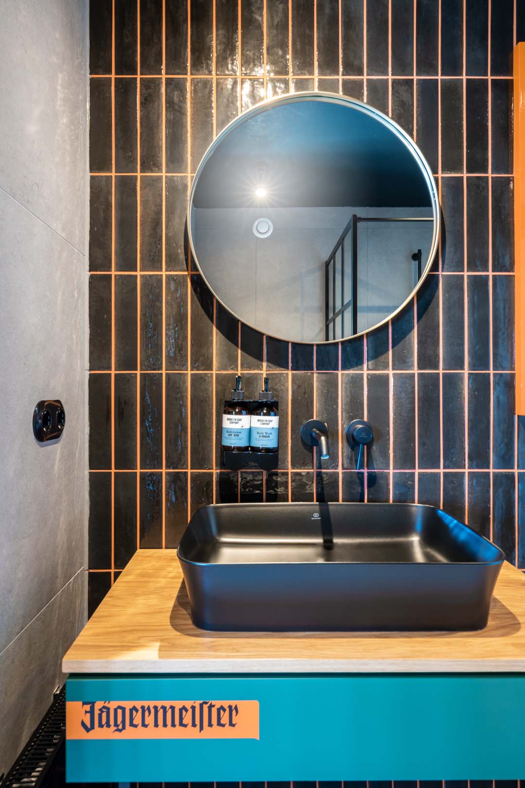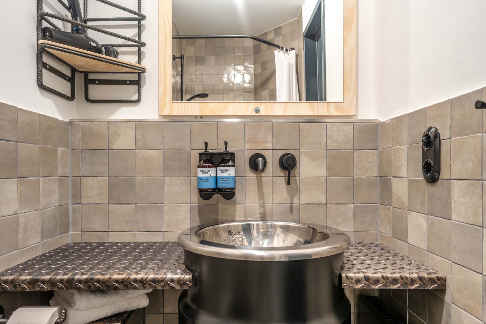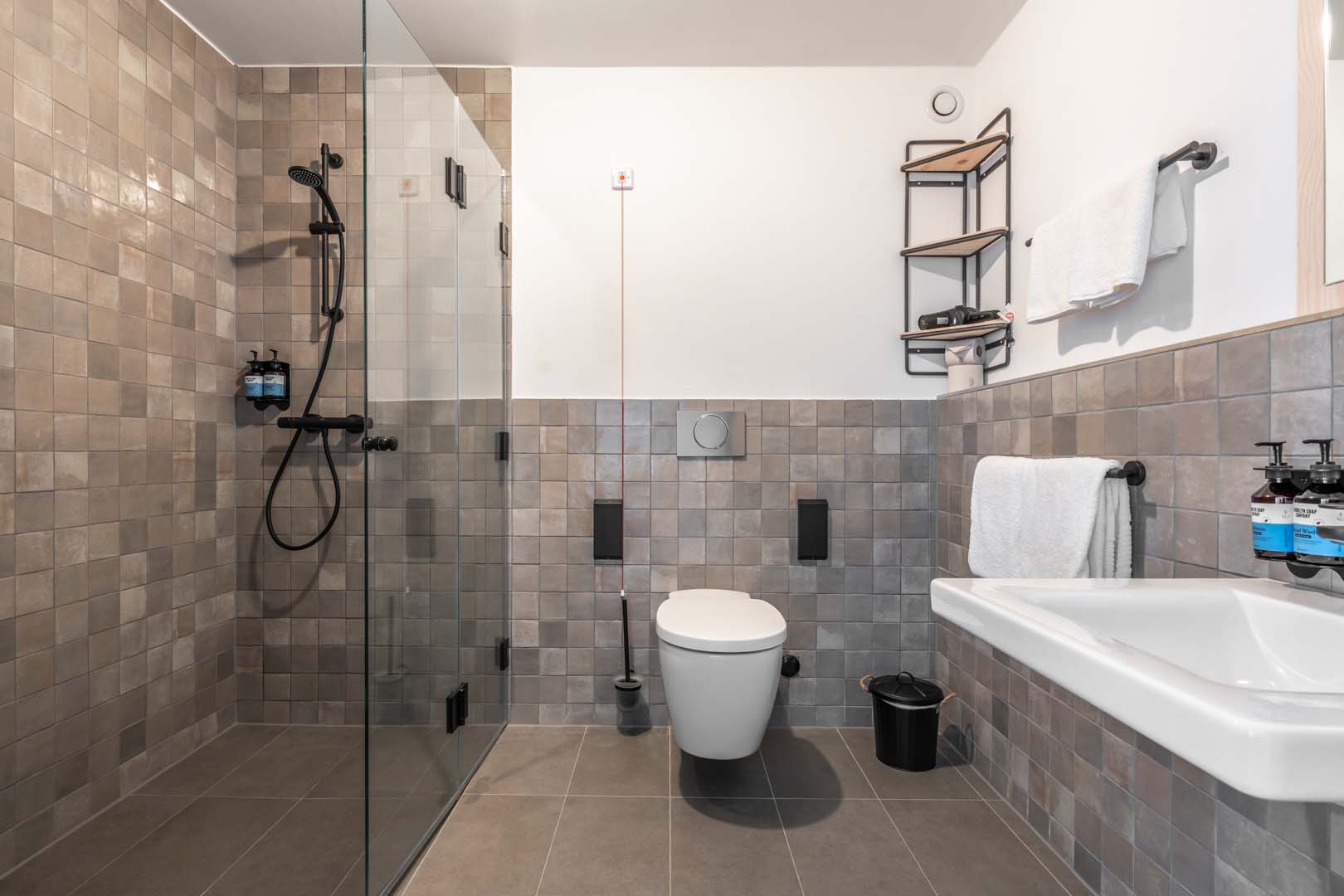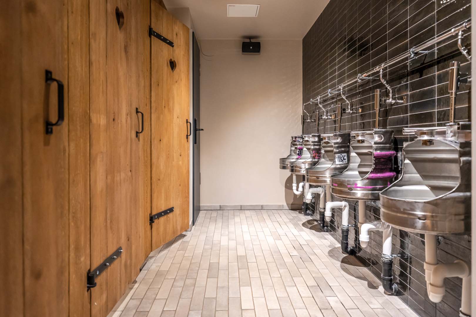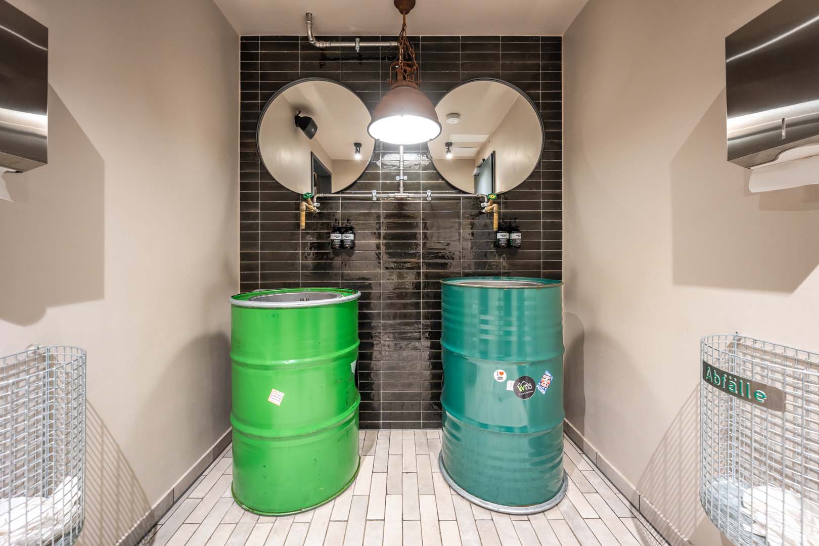Le projet de l'hôtel porte la signature d'Architekturbüro Ladehoff GmbH qui a utilisé largement la céramique dans les toilettes, le spa et le bar. Les petits formats à l'esprit artisanal des collections Crogiolo Lume, dans les tonalités Blue et Black, et Crogiolo Zellige Lana ont été posés sur les murs des toilettes communes. Pour le sol, le choix s'est porté sur deux collections en grès cérame effet béton Appeal et Terratech pour un style industriel.