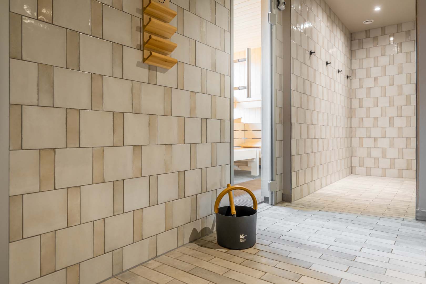 Dans le spa, les formats et les couleurs de la collection Crogiolo Rice, dans les versions Bianco 15x15 cm et Natural 5x15 cm, alternent pour donner au mur une allure énergique et dynamique, alors que le sol est habillé de la collection Terramix en coloration Bianco, soit des briquettes en grès d'inspiration nordique dans le format 7x28 cm. Cette collection a aussi été posée dans le bar en version Beige.