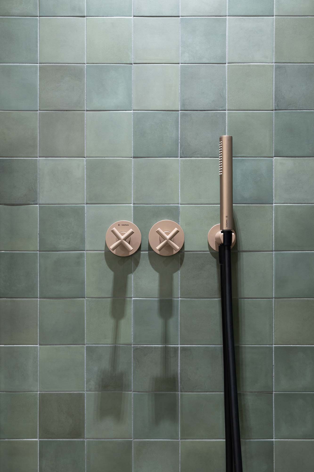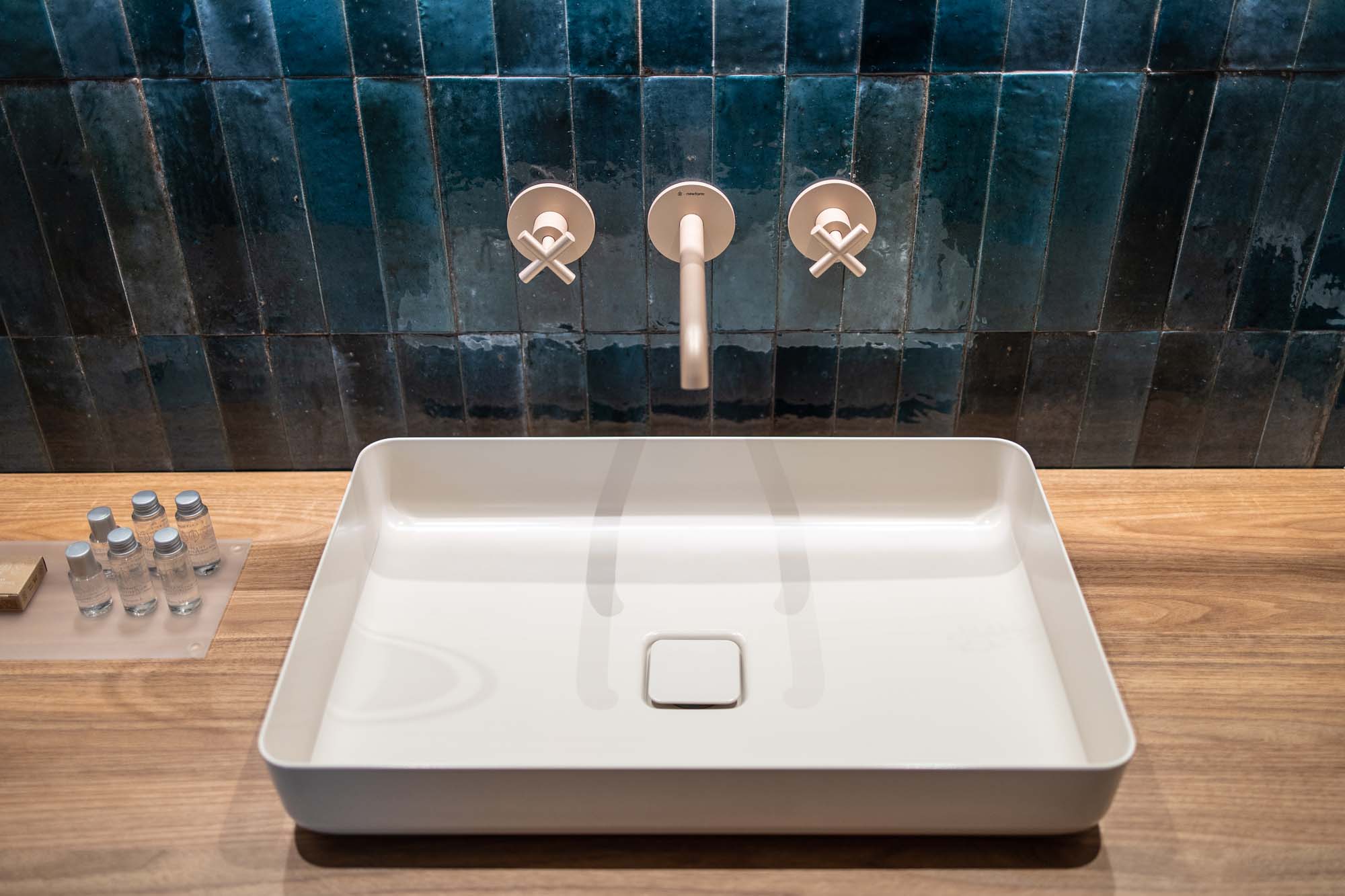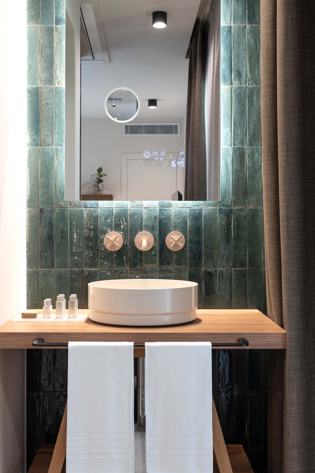 Les salles de bains des chambres ont été conçues pour leur apporter luminosité et caractère. À cet effet, leurs murs arborent deux revêtements extrêmement expressifs et vibrants, choisi parmi les propositions de la collection de petits formats Crogiolo, qui interprète un savoir-faire ancestral et le geste artisanal dans un esprit contemporain. L’espace douche a été réalisé avec Crogiolo Zellige, des briquettes carrées inspirées de la tradition nord-africaine, semblant faites à la main. C'est une collection qui se distingue par des dégradés qui, associés à la pose aléatoire, créent un effet de mélange très impactant. Pour chaque chambre, la zone du lavabo a été réalisée avec différentes couleurs de Crogiolo Lume, des briquettes au format de 6x24 cm à l'allure contemporaine et à l'effet ultra brillant, qui caractérisent la pièce de leurs variations de couleurs et de leurs graphismes à l'aspect imparfait et vécu, capables de faire vibrer les espaces.