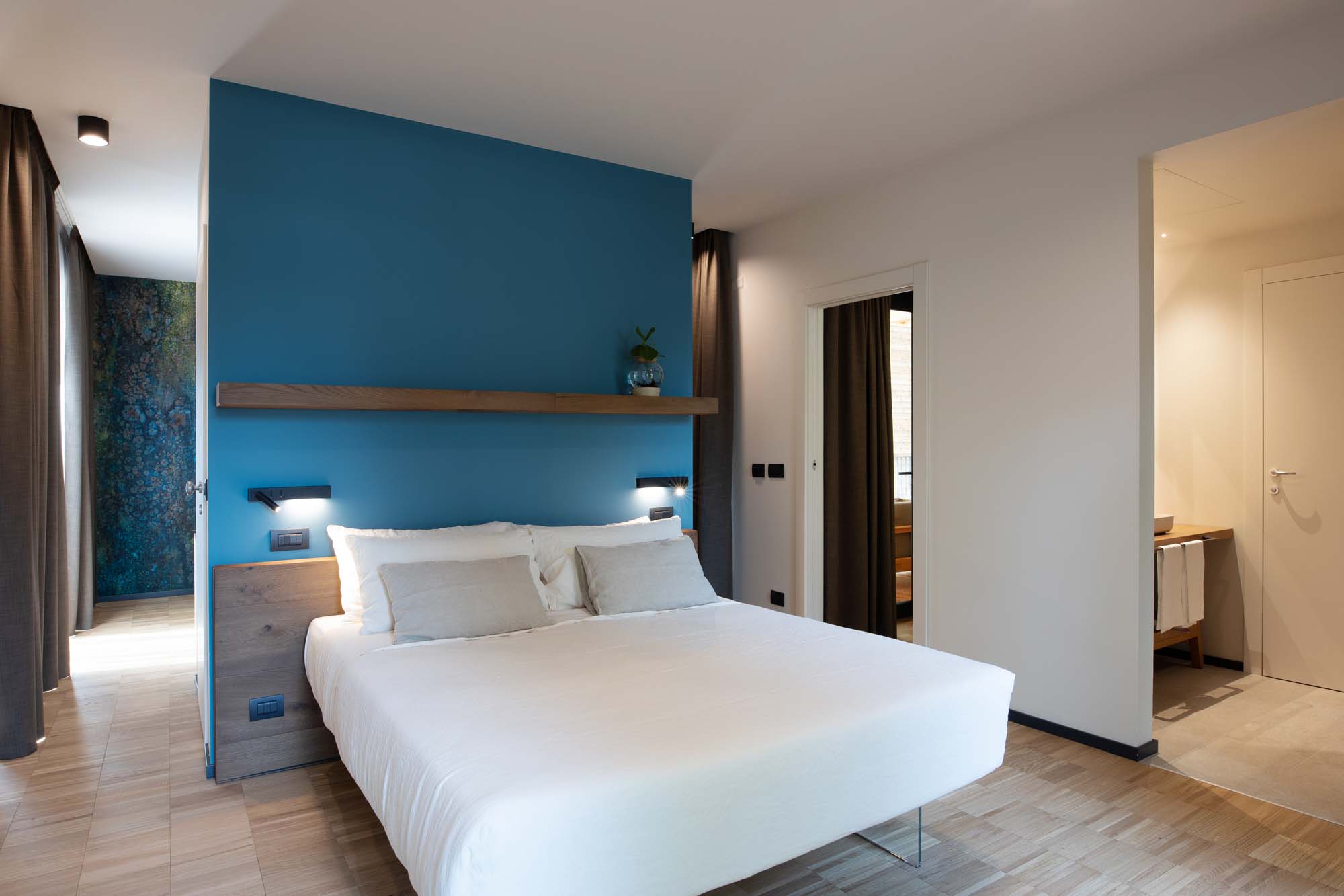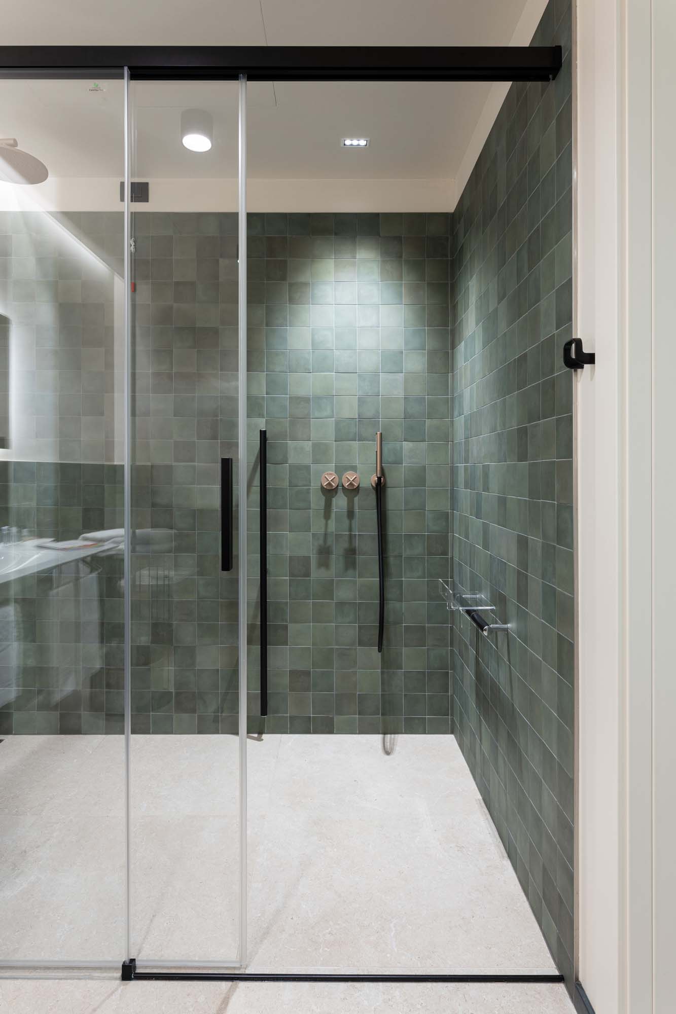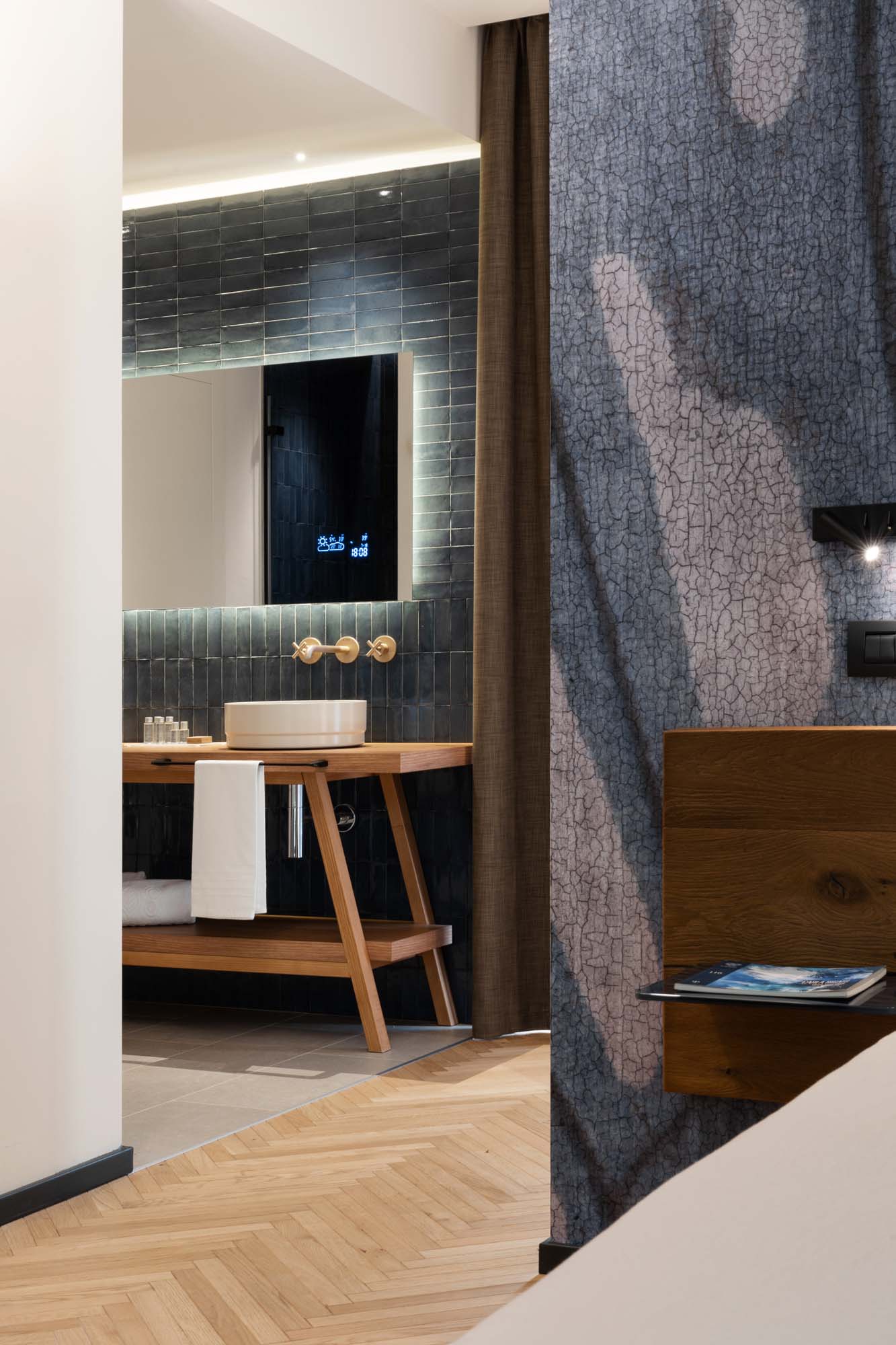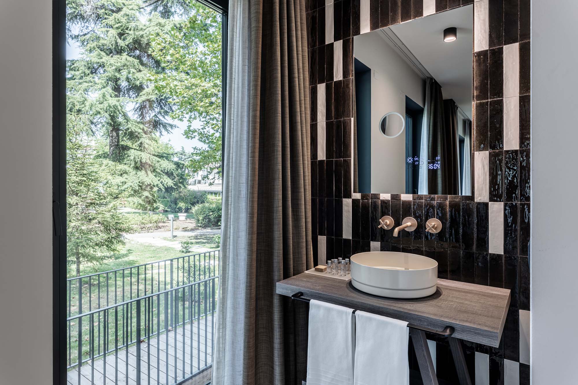 Les salles de bains des chambres ont été conçues pour leur apporter luminosité et caractère. À cet effet, leurs murs arborent deux revêtements extrêmement expressifs et vibrants, choisi parmi les propositions de la collection de petits formats Crogiolo, qui interprète un savoir-faire ancestral et le geste artisanal dans un esprit contemporain. L’espace douche a été réalisé avec Crogiolo Zellige, des briquettes carrées inspirées de la tradition nord-africaine, semblant faites à la main. C'est une collection qui se distingue par des dégradés qui, associés à la pose aléatoire, créent un effet de mélange très impactant. Pour chaque chambre, la zone du lavabo a été réalisée avec différentes couleurs de Crogiolo Lume, des briquettes au format de 6x24 cm à l'allure contemporaine et à l'effet ultra brillant, qui caractérisent la pièce de leurs variations de couleurs et de leurs graphismes à l'aspect imparfait et vécu, capables de faire vibrer les espaces.
