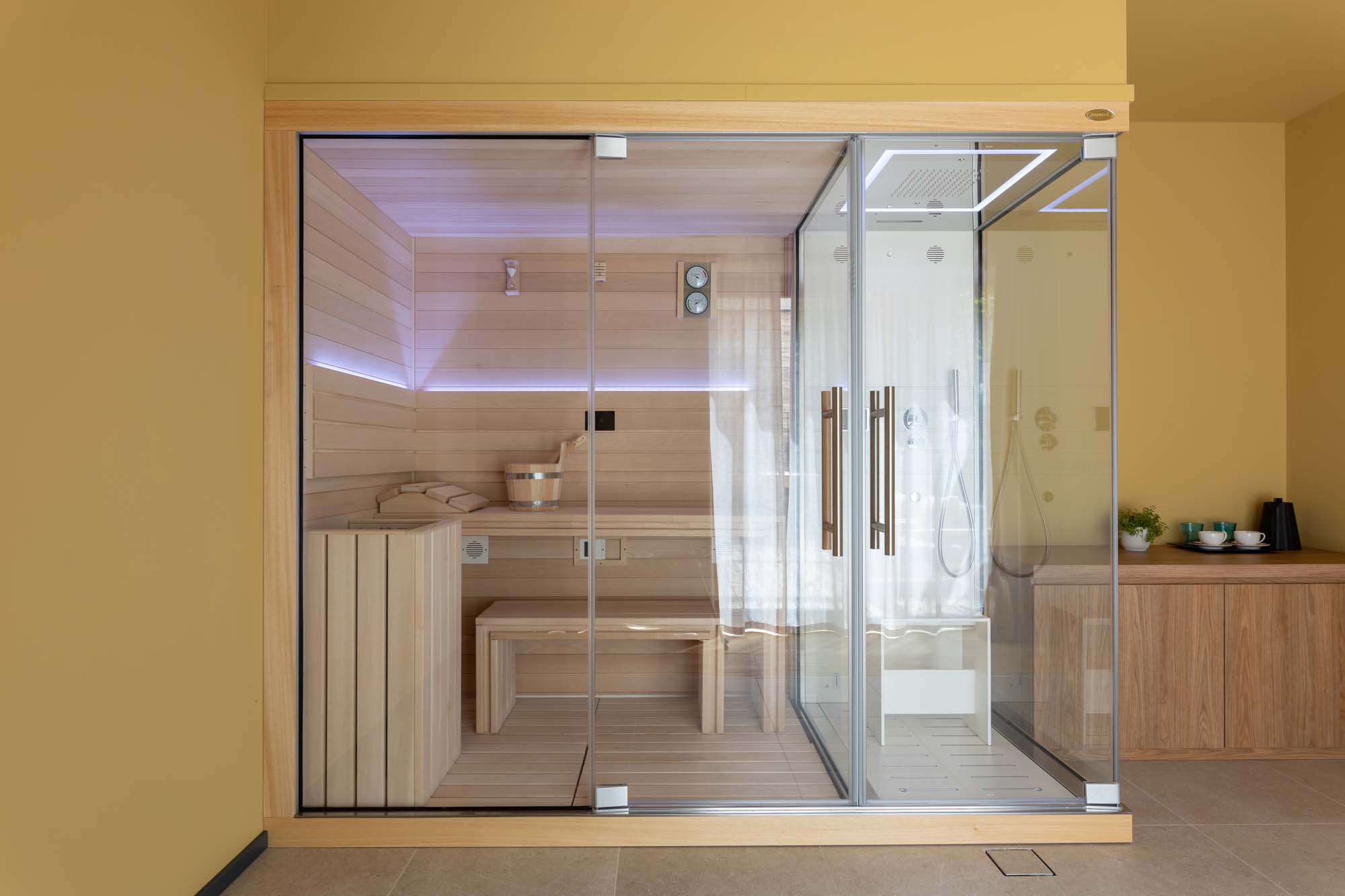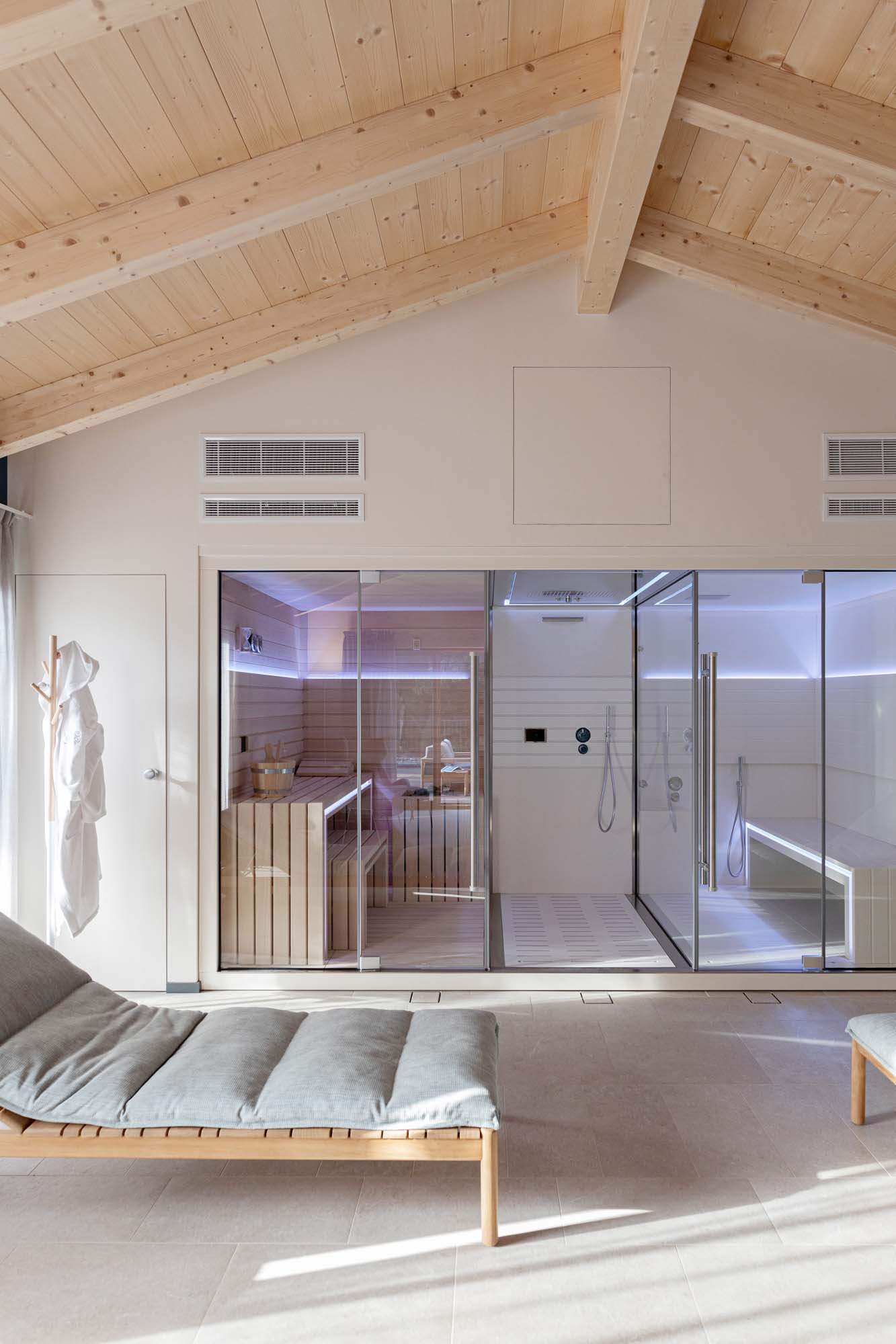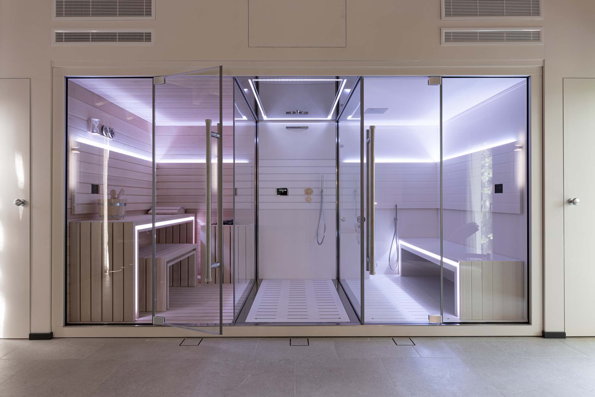 Une importance particulière a été accordée à la zone spa dont les sols et une partie des murs sont revêtus avec la collection Mystone Limestone Sand, un grès cérame à la tonalité chaude et naturelle qui crée une atmosphère relaxante et accueillante, en parfaite harmonie avec les éléments naturels au cœur desquels sont nichés les pavillons. La pose des carreaux en grès cérame, combinant différents formats, crée un rythme visuel dynamique et contemporain.