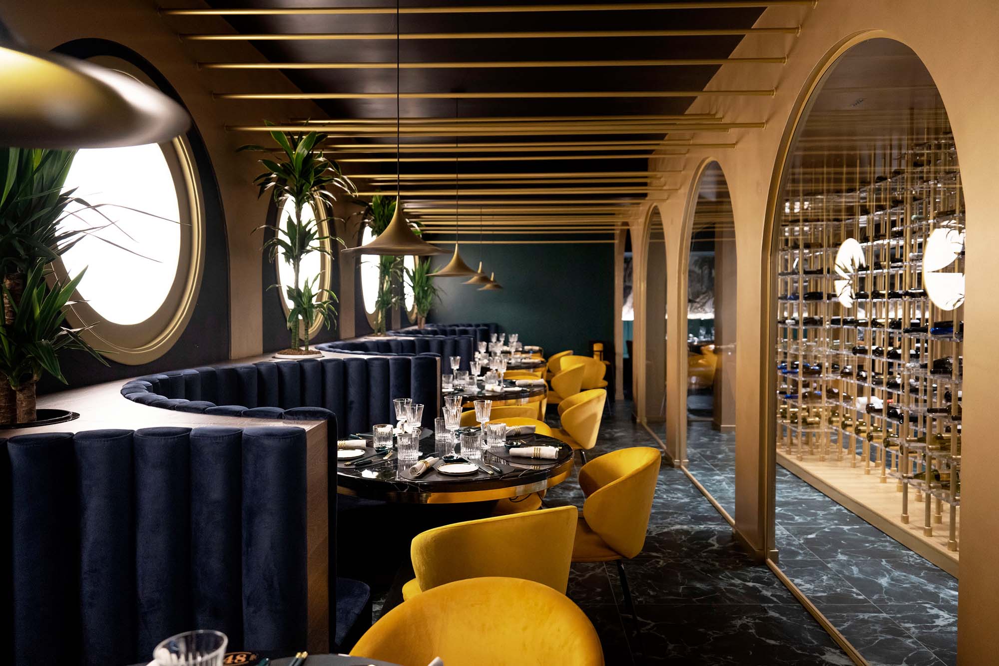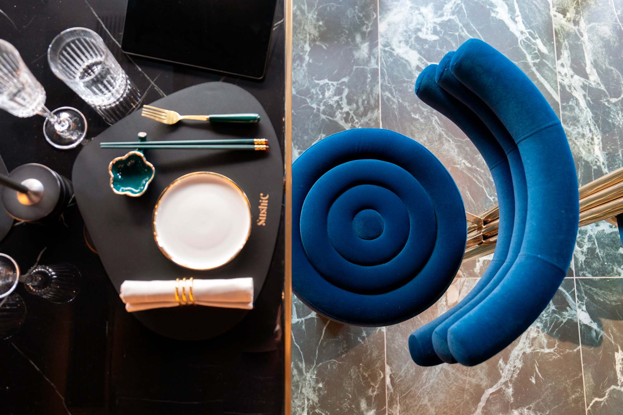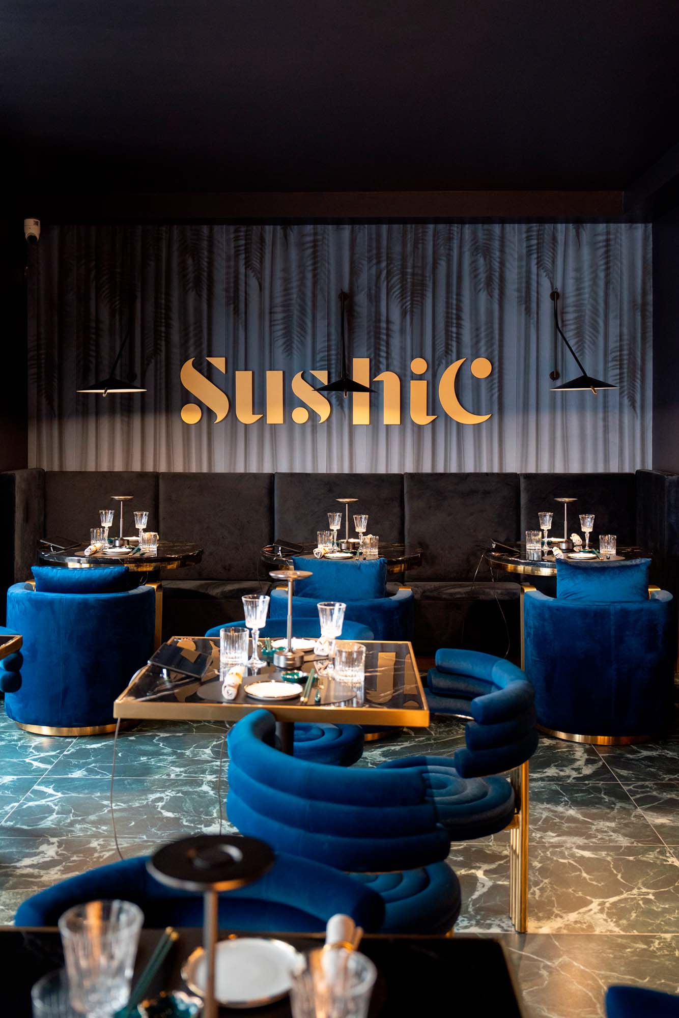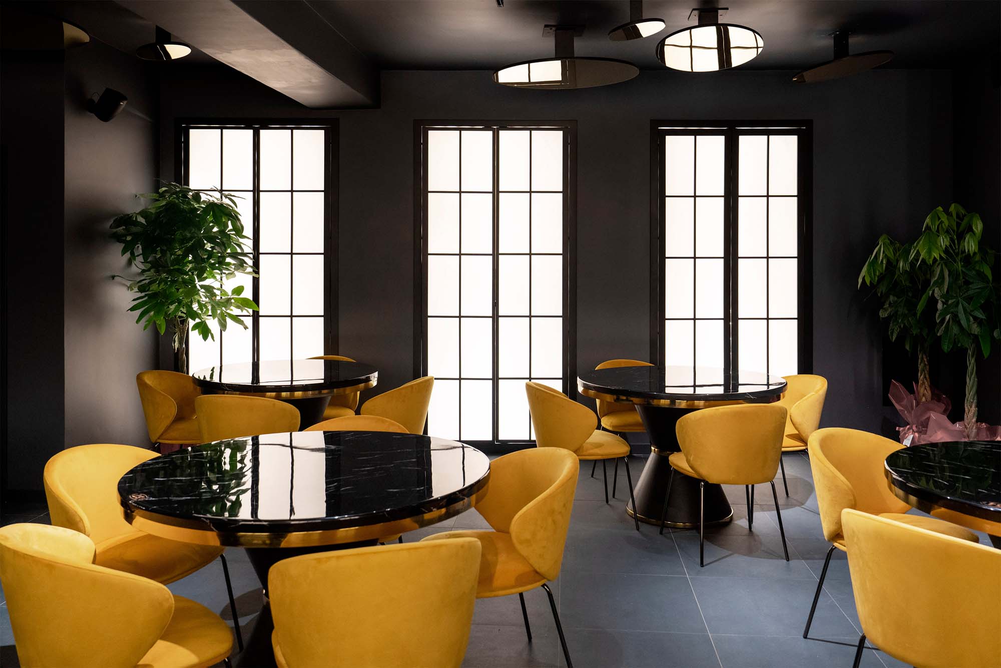 bien comme un lieu plurifonctionnel où trouver des zones selfies, des coins boissons, des canapés circulaires et des décos optical de grand impact esthétique. La zone de préparation du sushi et la riche cantine font partie intégrante de l'endroit qui mise sur un aménagement visible à figer sur un cliché.
