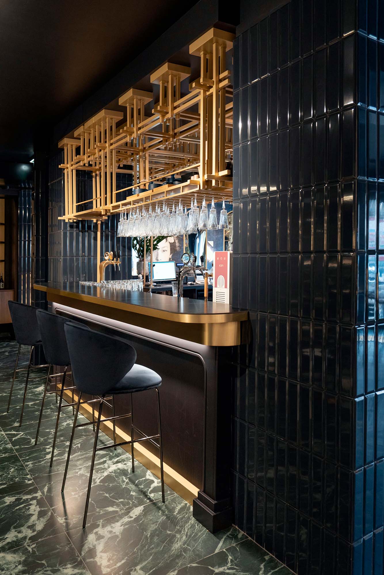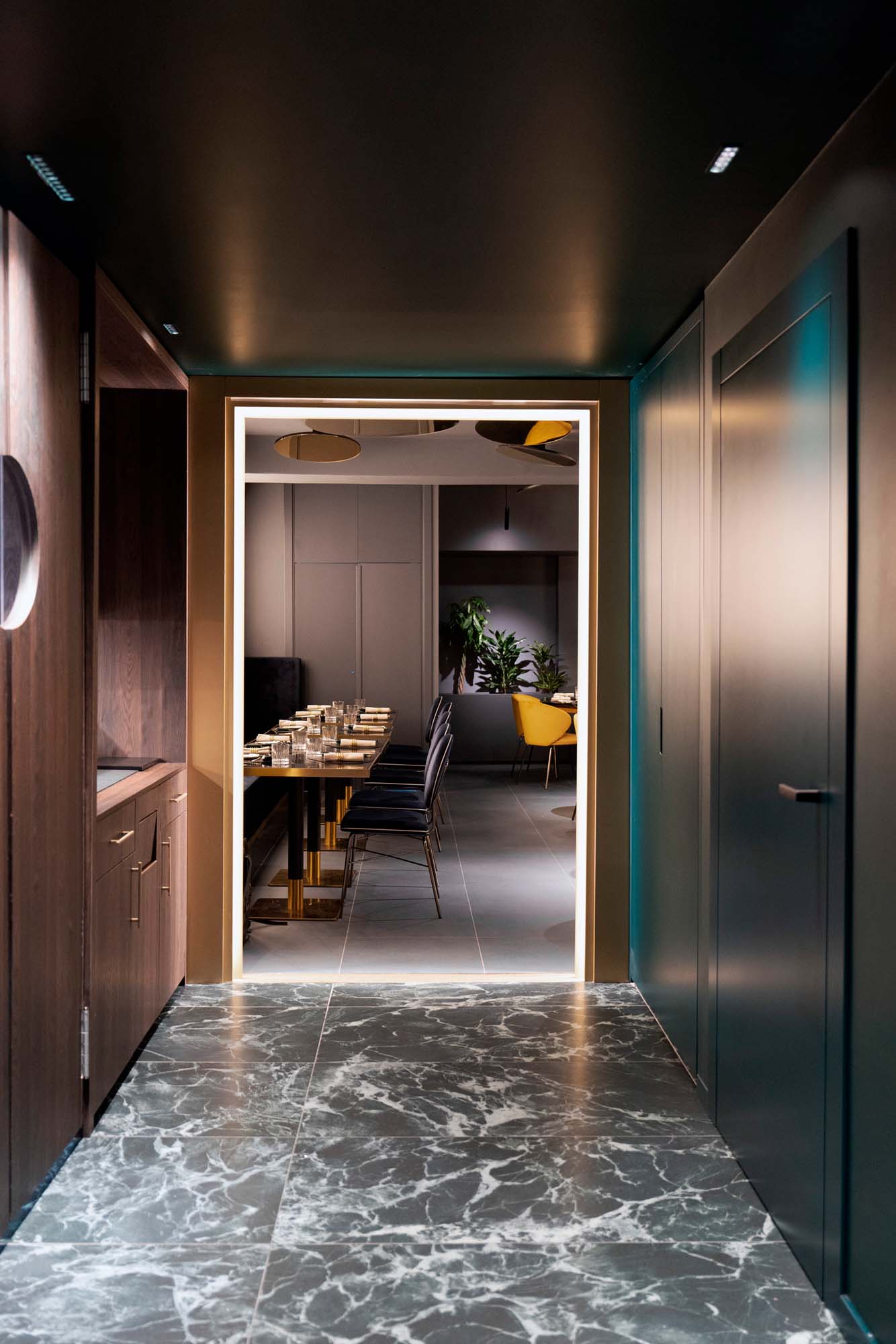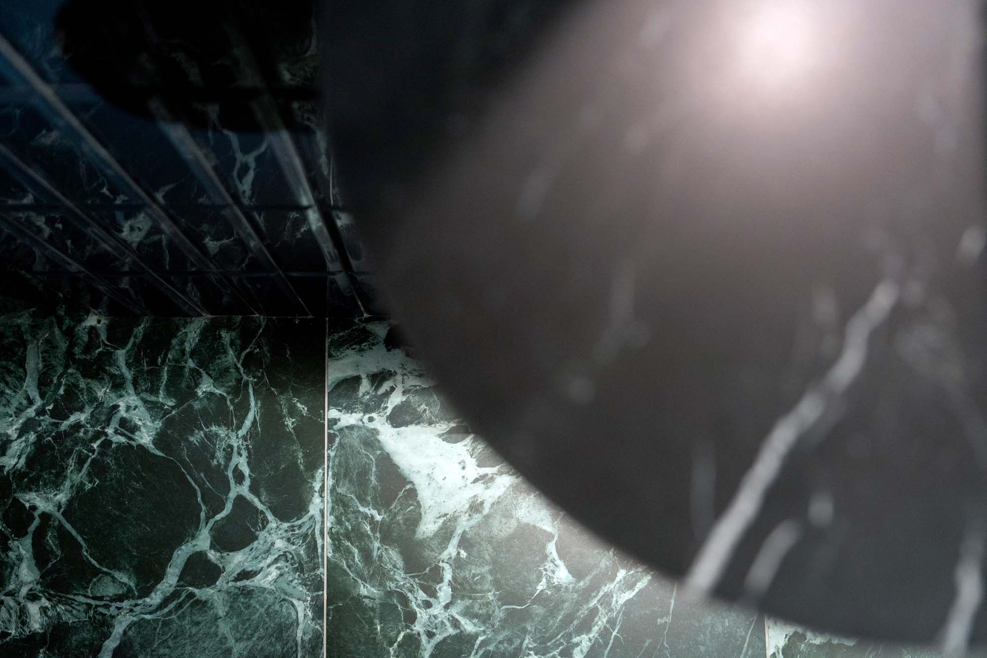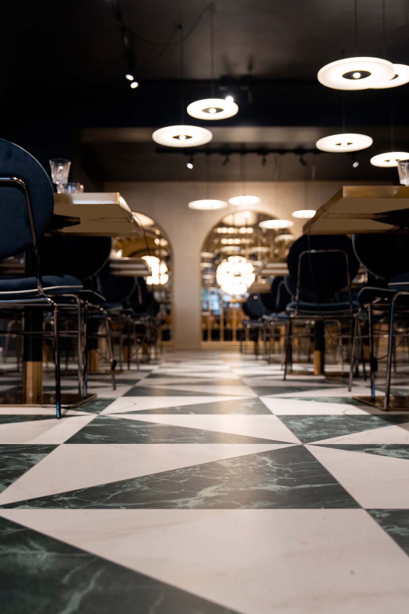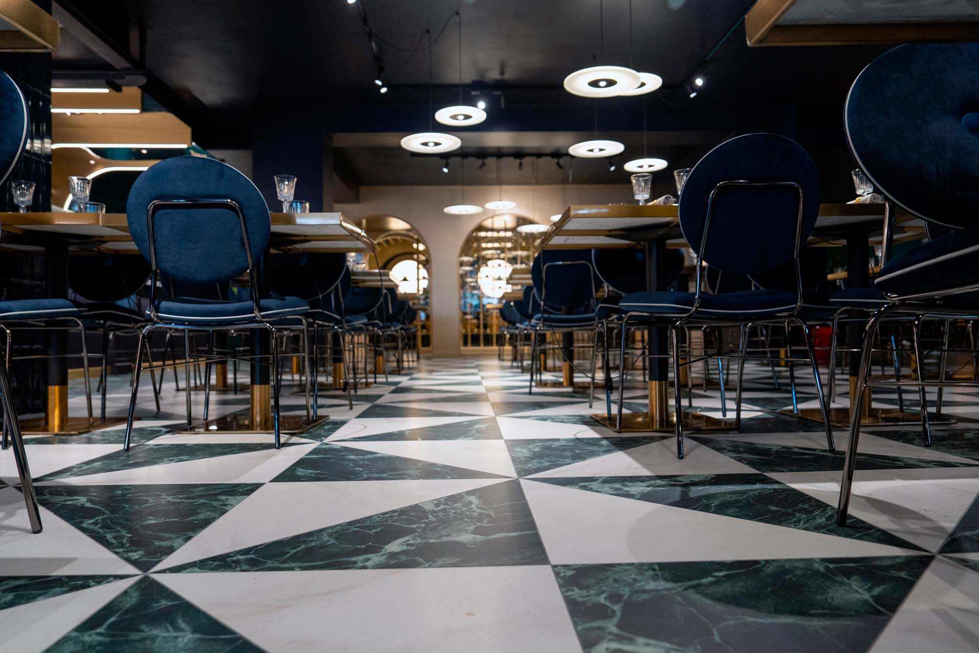 Des matières opulentes, des colorations élégantes et des détails de luxe caractérisent les lieux, comme l'imposant revêtement de sol à triangles en grès cérame imitation marbre qui singularise la grande salle centrale, en pose géométrique effet triangulaire. Deux différentes collections ont été sélectionnées pour le sol, toutes deux inspirées du marbre : Allmarble en version Verde Aver, avec de superbes veines dans les tonalités du vert, et en contraste, un grès imitation marbre dans les nuances ivoire.
