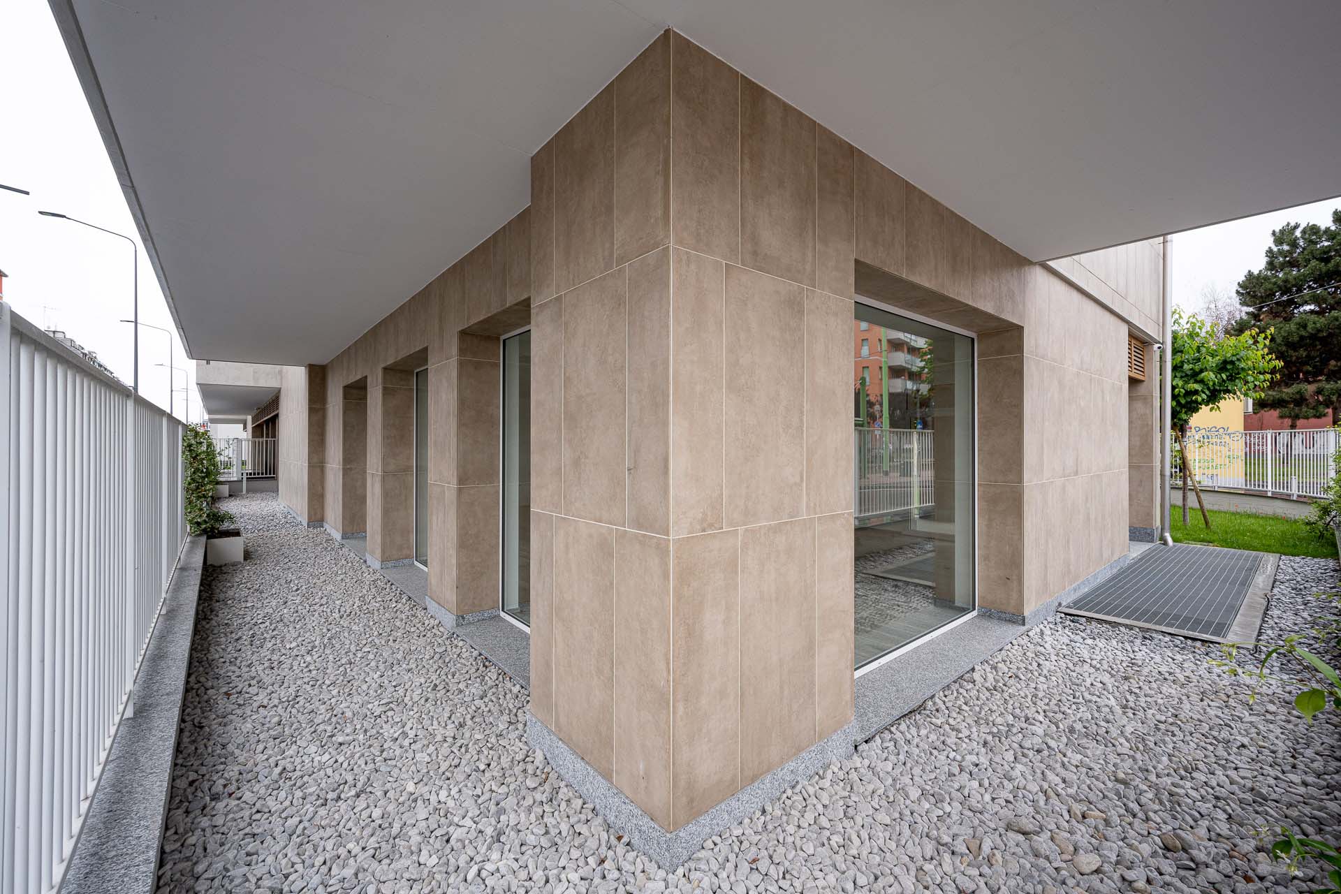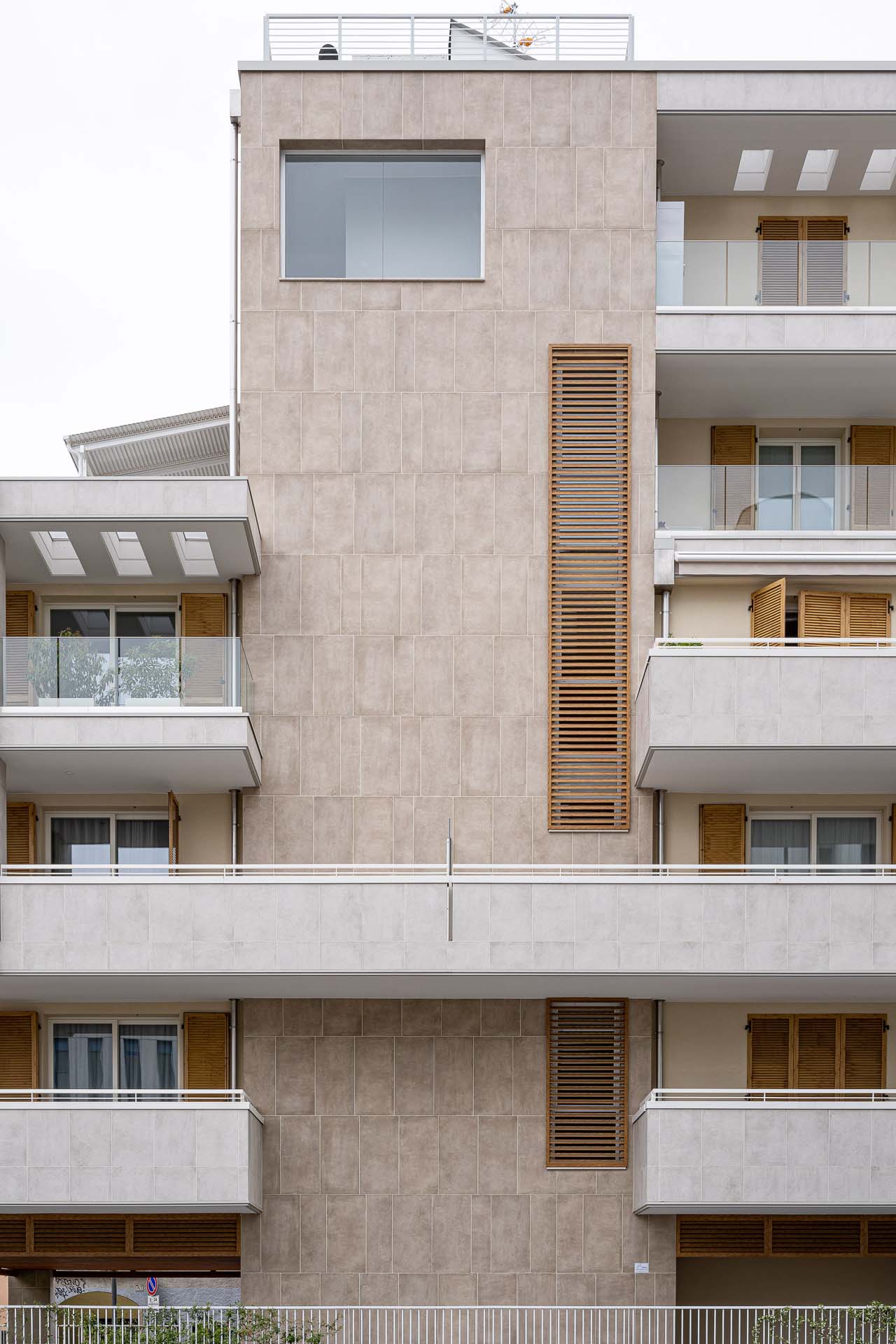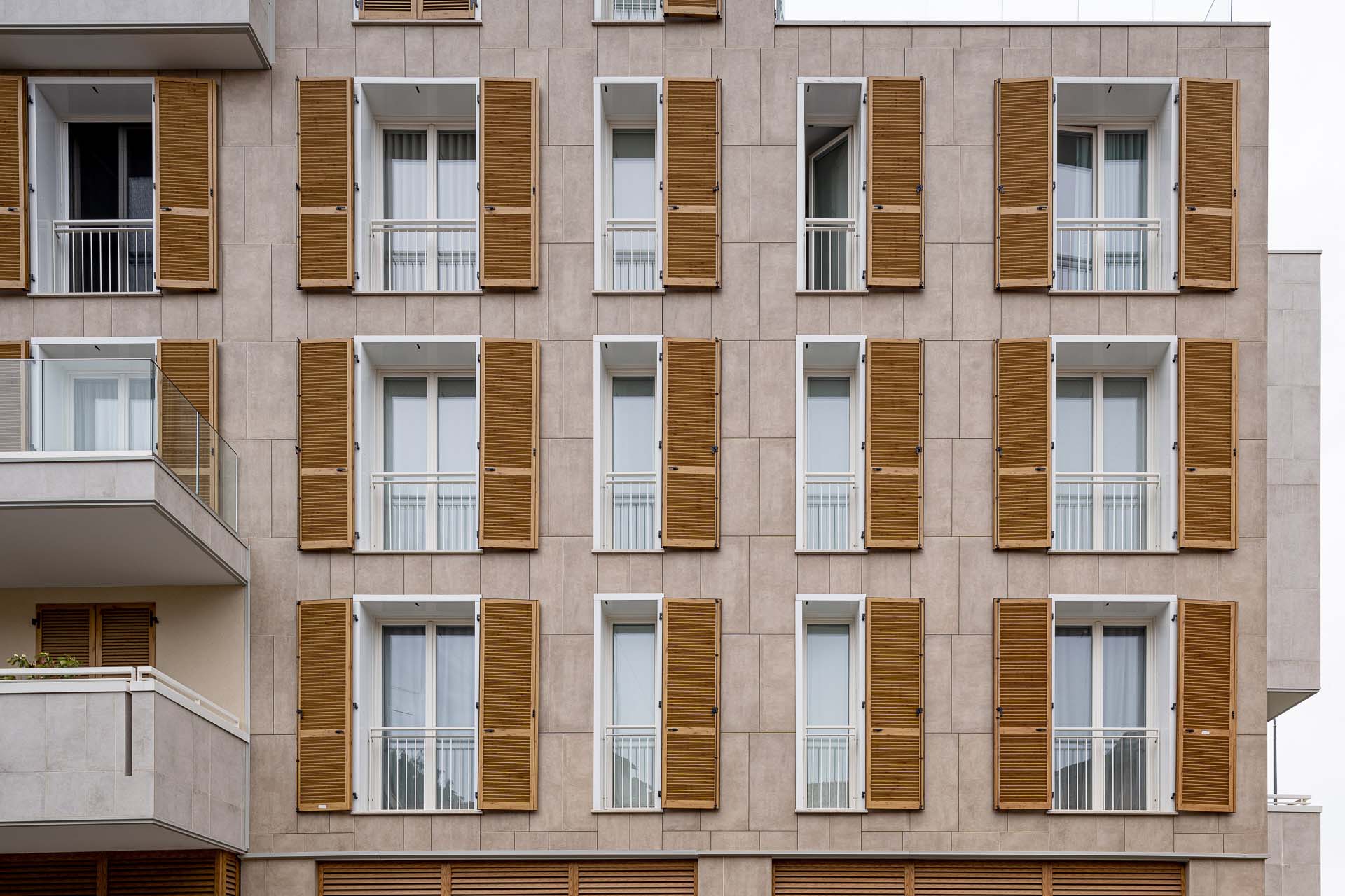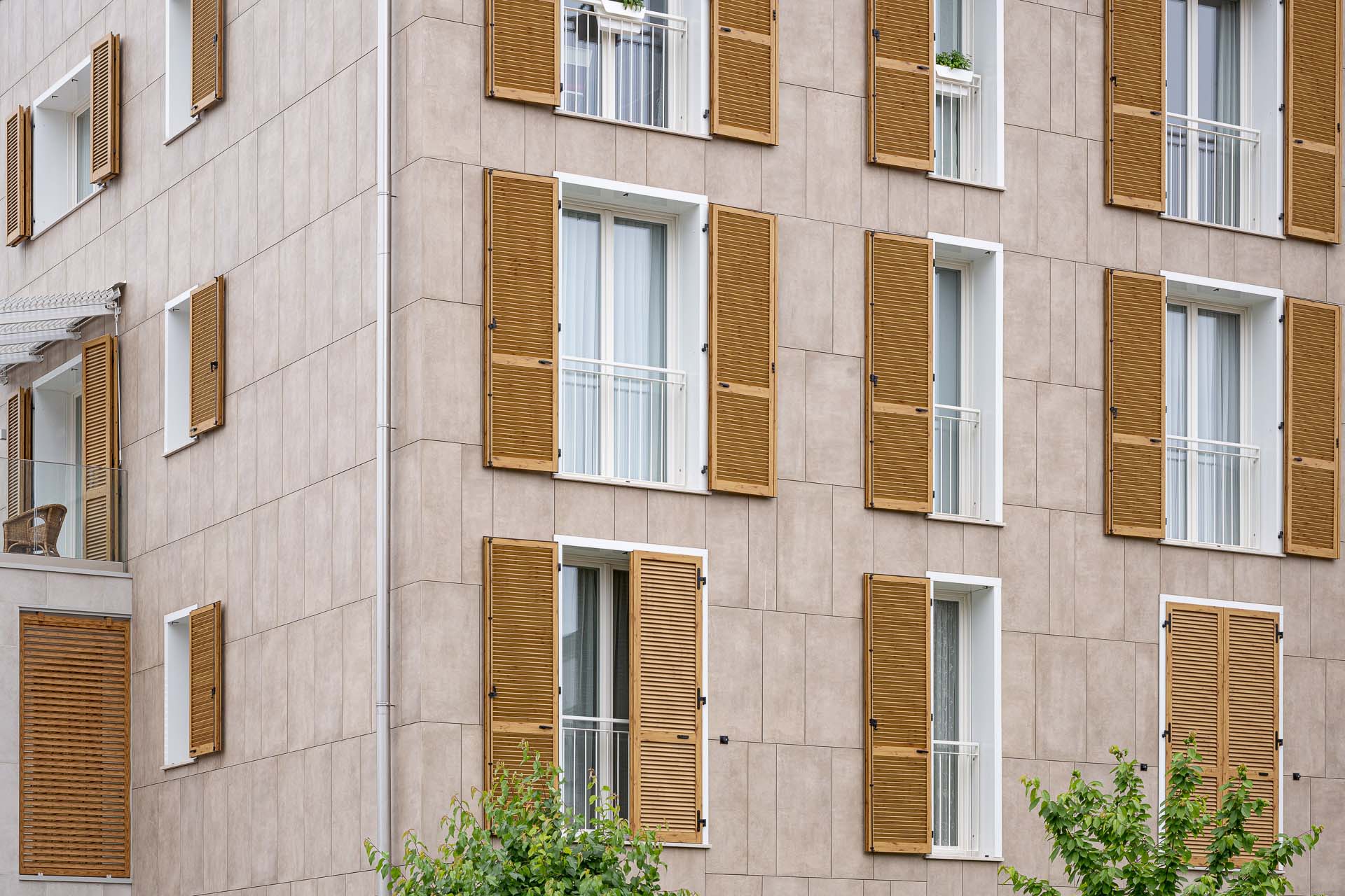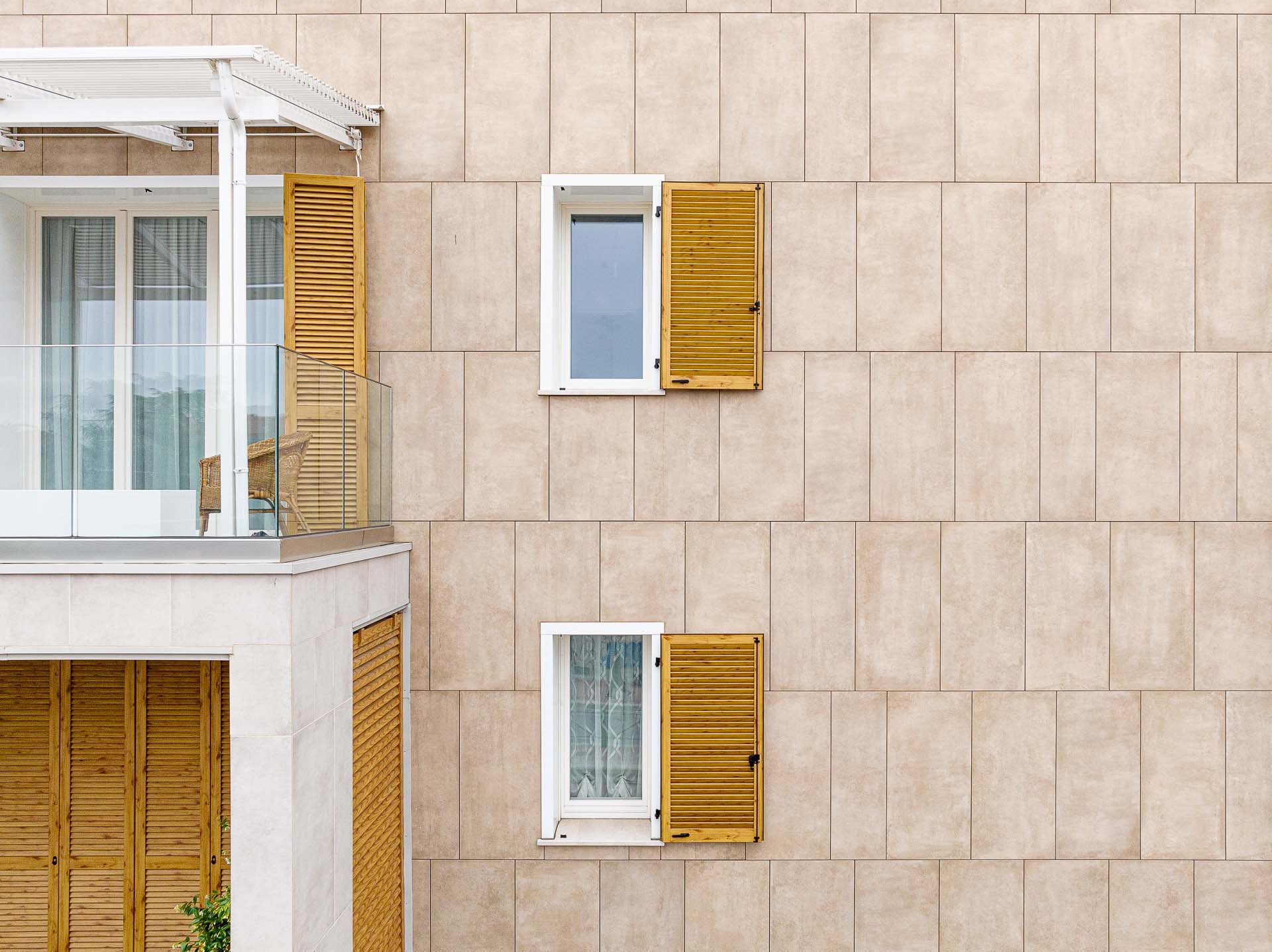 Les façades sont caractérisées par l'alternance de parties pleines et en encorbellement : des volumes émergent de la façade, soulignés par les garde-corps en verre invisibles, laissant apparaître le dessin de la structure en portique qui enclot la terrasse. « Les porte-à-faux sont l'élément qualifiant du projet, dont la planimétrie est simple en soi. Les brise-soleil fixes, placés sur certaines parties des terrasses, enrichissent le dessin des façades non seulement d'un point de vue esthétique mais aussi fonctionnel. » Pour le revêtement des façades en grès cérame - la série Clays dans les couleurs Sand et Cotton au format 60x120 cm - deux techniques de fixation ont été adoptées : dans certaines parties des balcons, les carreaux ont été collés, et, au niveau des parois ventilées, ils ont été fixés mécaniquement sur des structures porteuses. Dans le détail, le système de fixation crochets non apparents AGS a été utilisé : la sous-structure porteuse est fixée à l'aide d'agrafes et le carreau est fixé sur la surface arrière à l'aide de chevilles spéciales. « Les parties collées », précise Simone Dominoni, « correspondent aux zones de service comme les cages d'escalier, ou aux parties qui ne nécessitent pas d'isolation. Sur la façade, nous sommes partis d'un format de 60x120 cm, dans lequel des sous-mesures ont été coupées pour créer un dessin en décalé qui anime esthétiquement les parties pleines des murs. Les sous-multiples nous ont également permis de minimiser les déchets liés à la découpe des carreaux. »