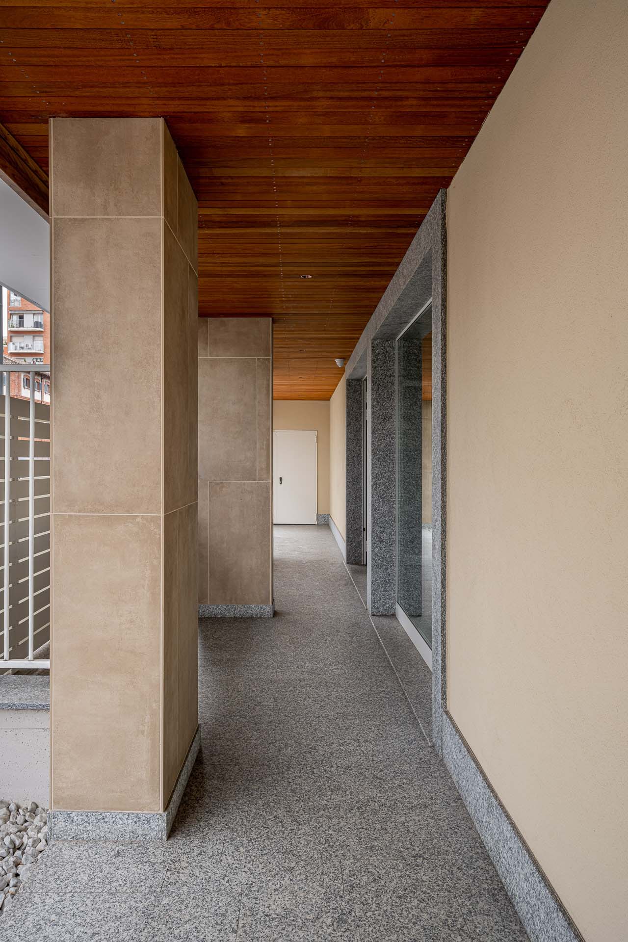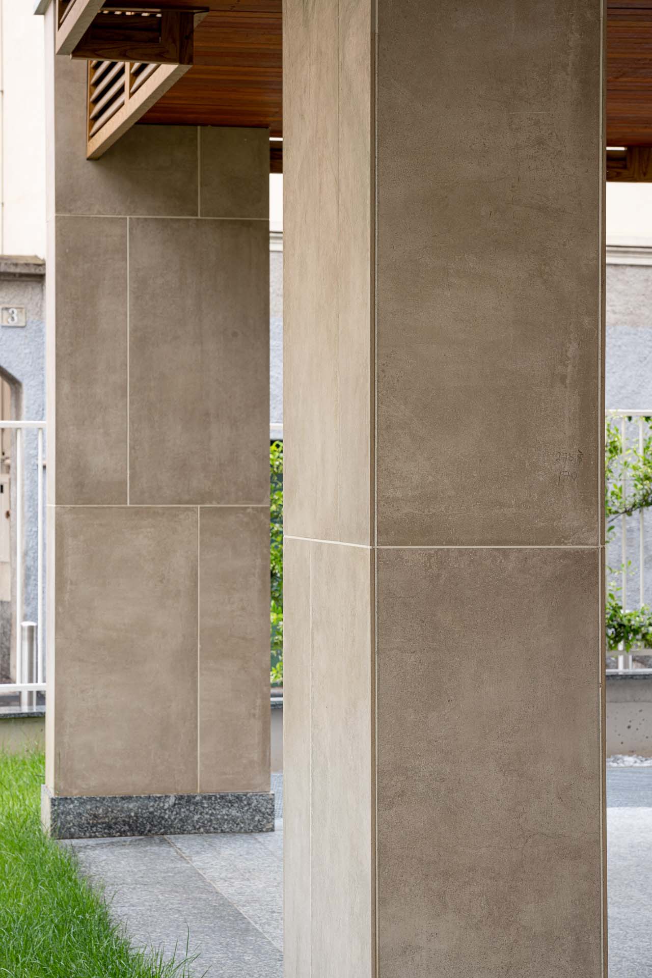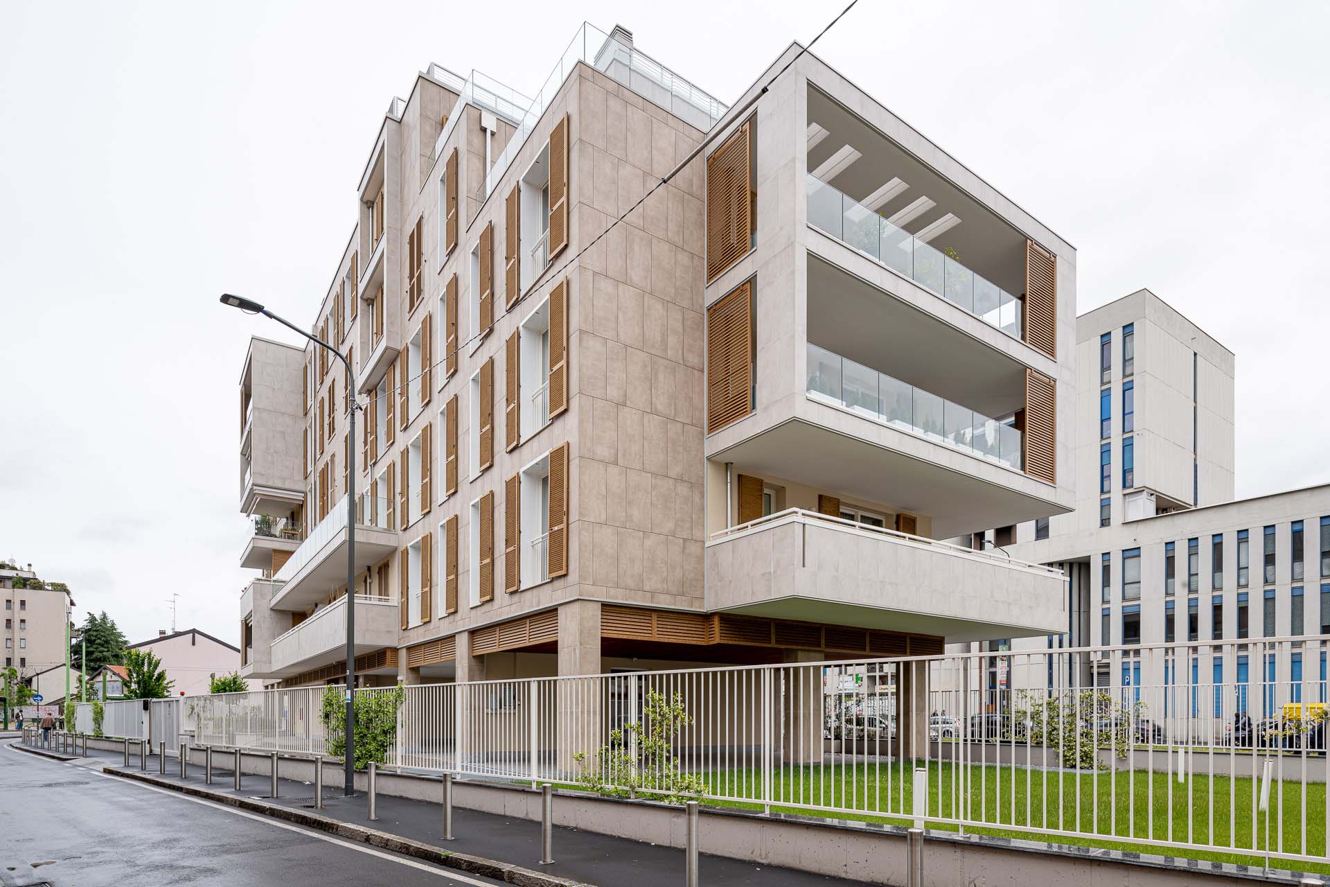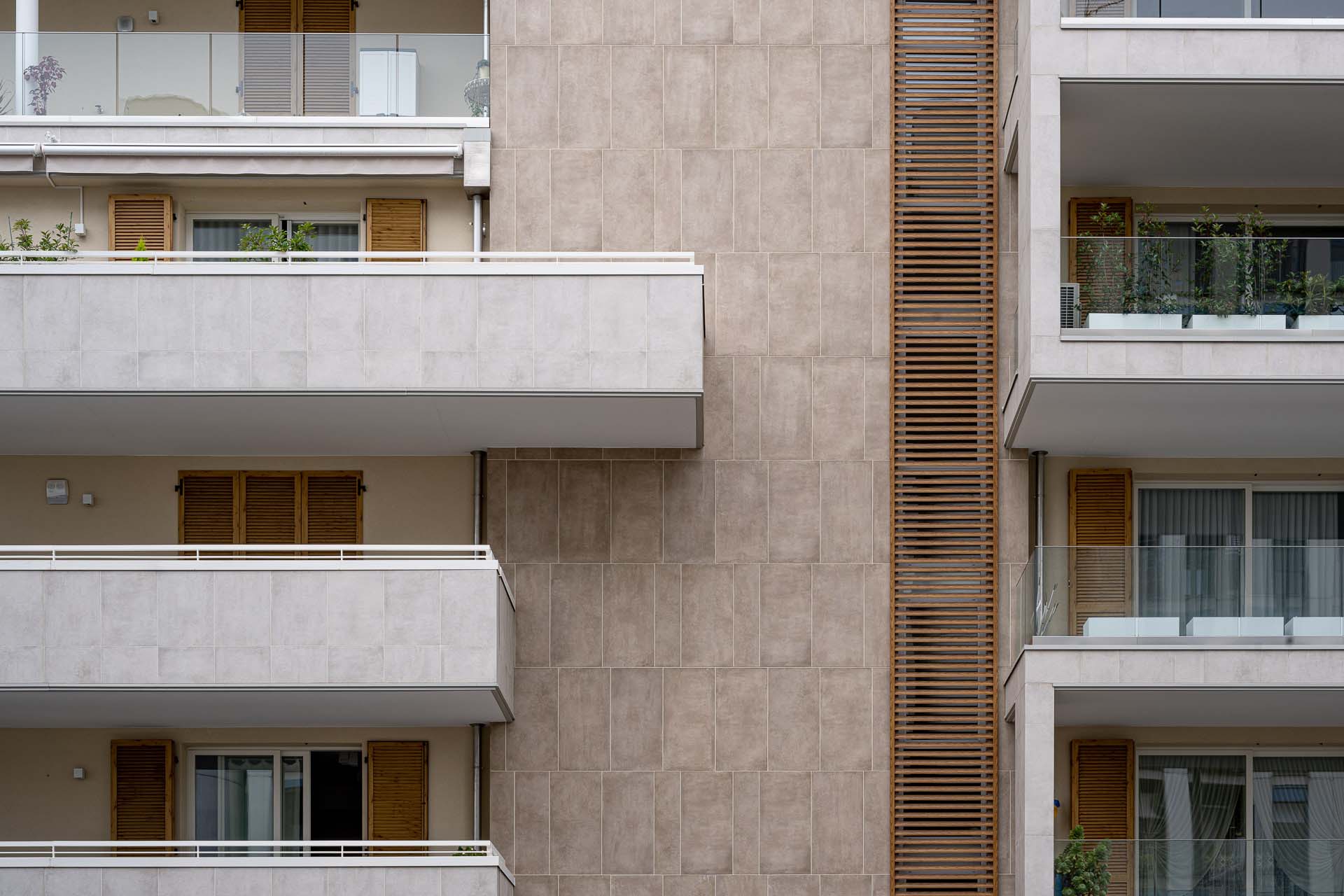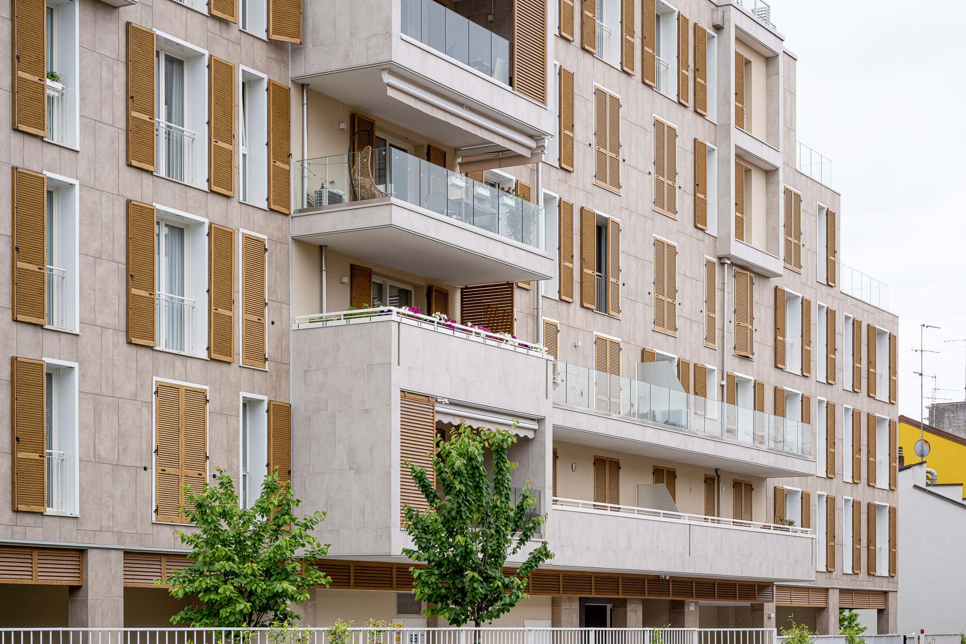 Les façades sont caractérisées par l'alternance de parties pleines et en encorbellement : des volumes émergent de la façade, soulignés par les garde-corps en verre invisibles, laissant apparaître le dessin de la structure en portique qui enclot la terrasse. « Les porte-à-faux sont l'élément qualifiant du projet, dont la planimétrie est simple en soi. Les brise-soleil fixes, placés sur certaines parties des terrasses, enrichissent le dessin des façades non seulement d'un point de vue esthétique mais aussi fonctionnel. » Pour le revêtement des façades en grès cérame - la série Clays dans les couleurs Sand et Cotton au format 60x120 cm - deux techniques de fixation ont été adoptées : dans certaines parties des balcons, les carreaux ont été collés, et, au niveau des parois ventilées, ils ont été fixés mécaniquement sur des structures porteuses. Dans le détail, le système de fixation crochets non apparents AGS a été utilisé : la sous-structure porteuse est fixée à l'aide d'agrafes et le carreau est fixé sur la surface arrière à l'aide de chevilles spéciales. « Les parties collées », précise Simone Dominoni, « correspondent aux zones de service comme les cages d'escalier, ou aux parties qui ne nécessitent pas d'isolation. Sur la façade, nous sommes partis d'un format de 60x120 cm, dans lequel des sous-mesures ont été coupées pour créer un dessin en décalé qui anime esthétiquement les parties pleines des murs. Les sous-multiples nous ont également permis de minimiser les déchets liés à la découpe des carreaux. »