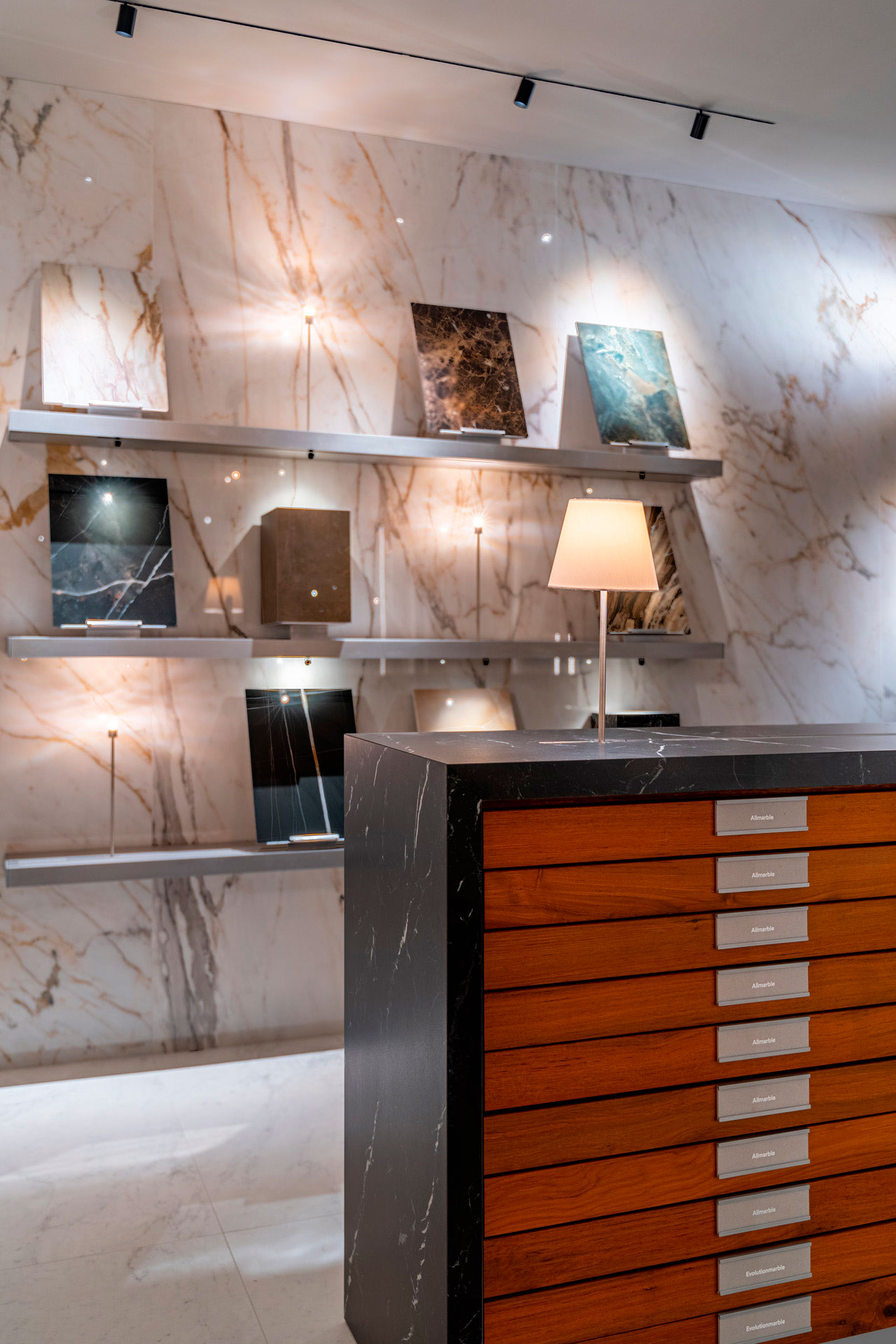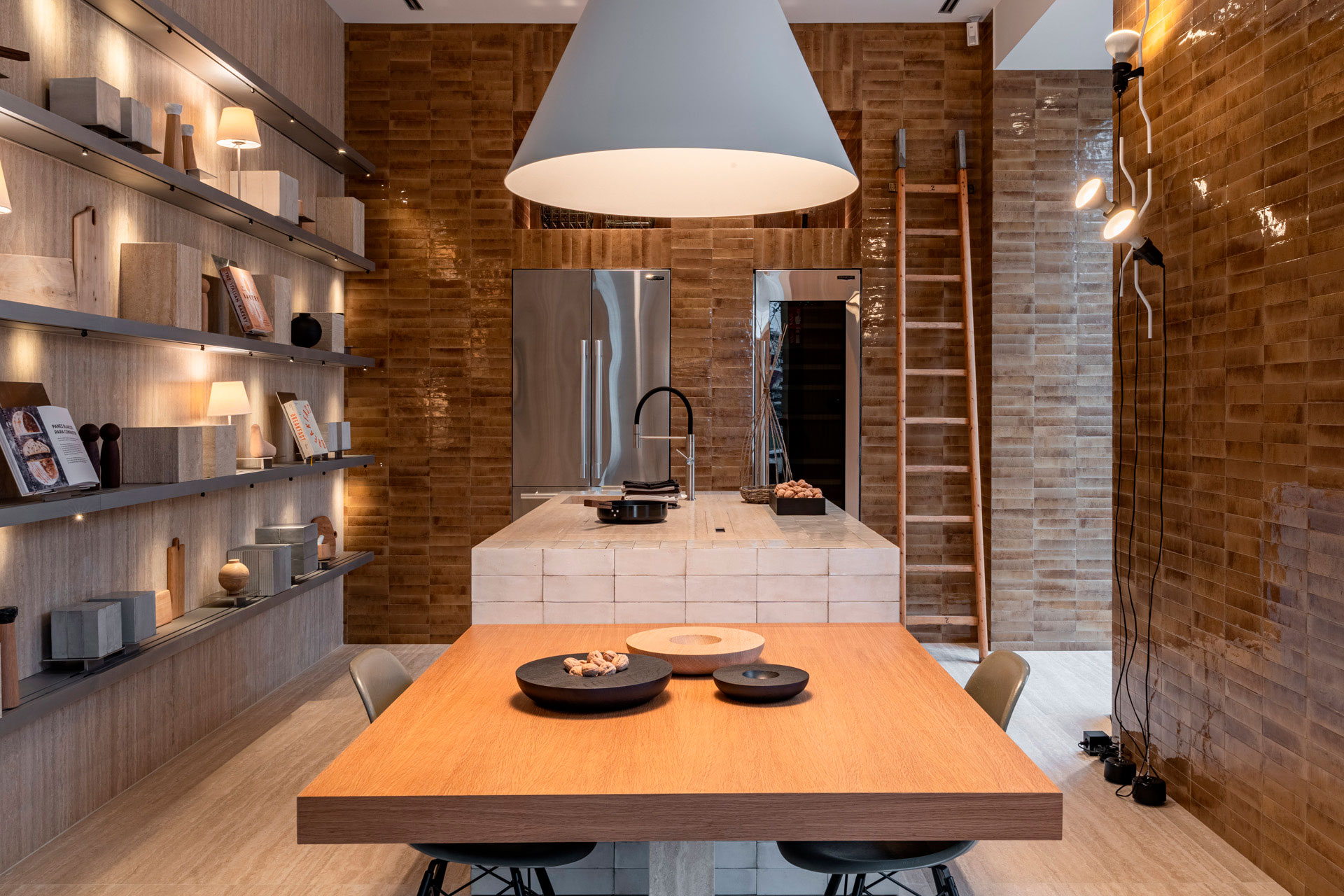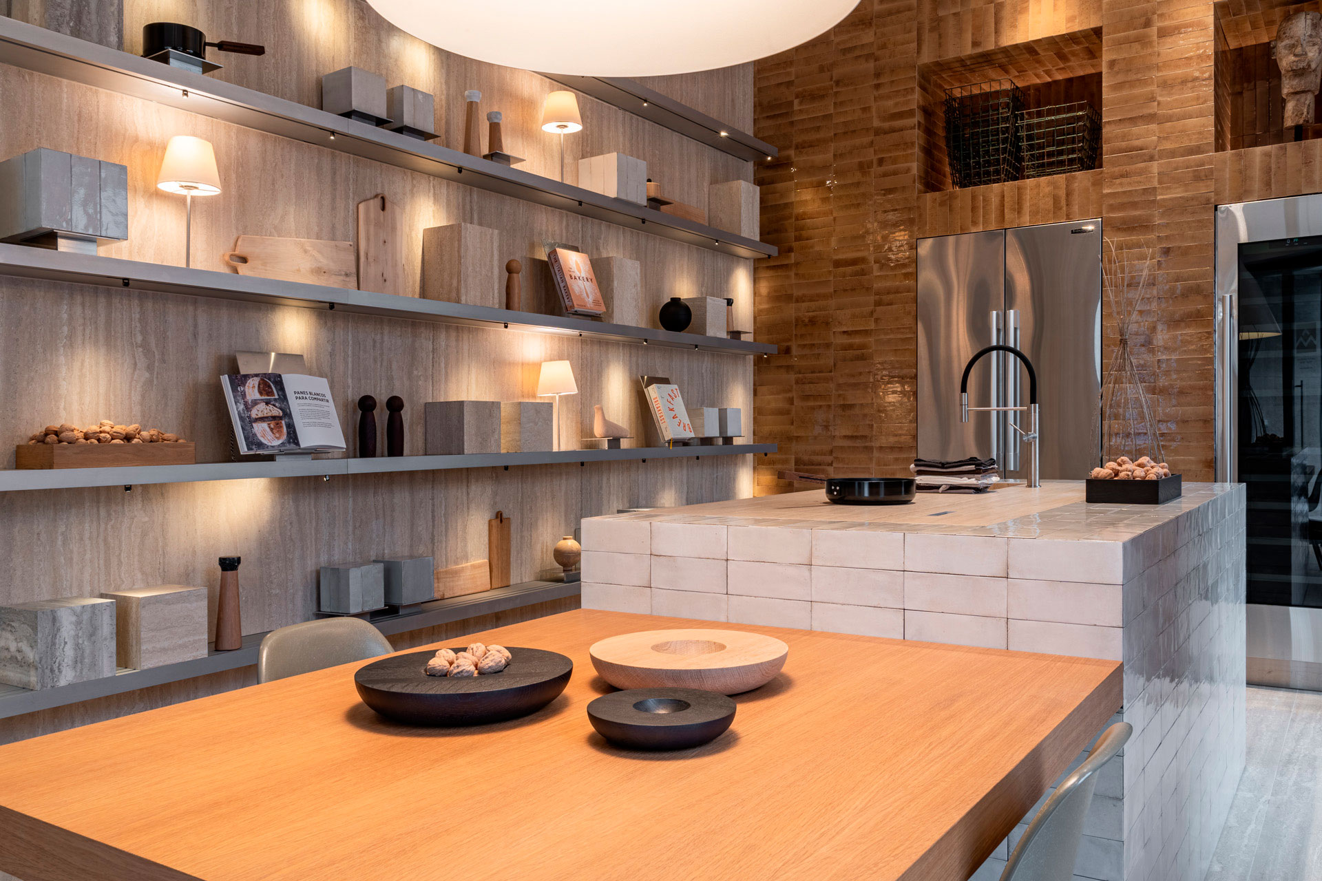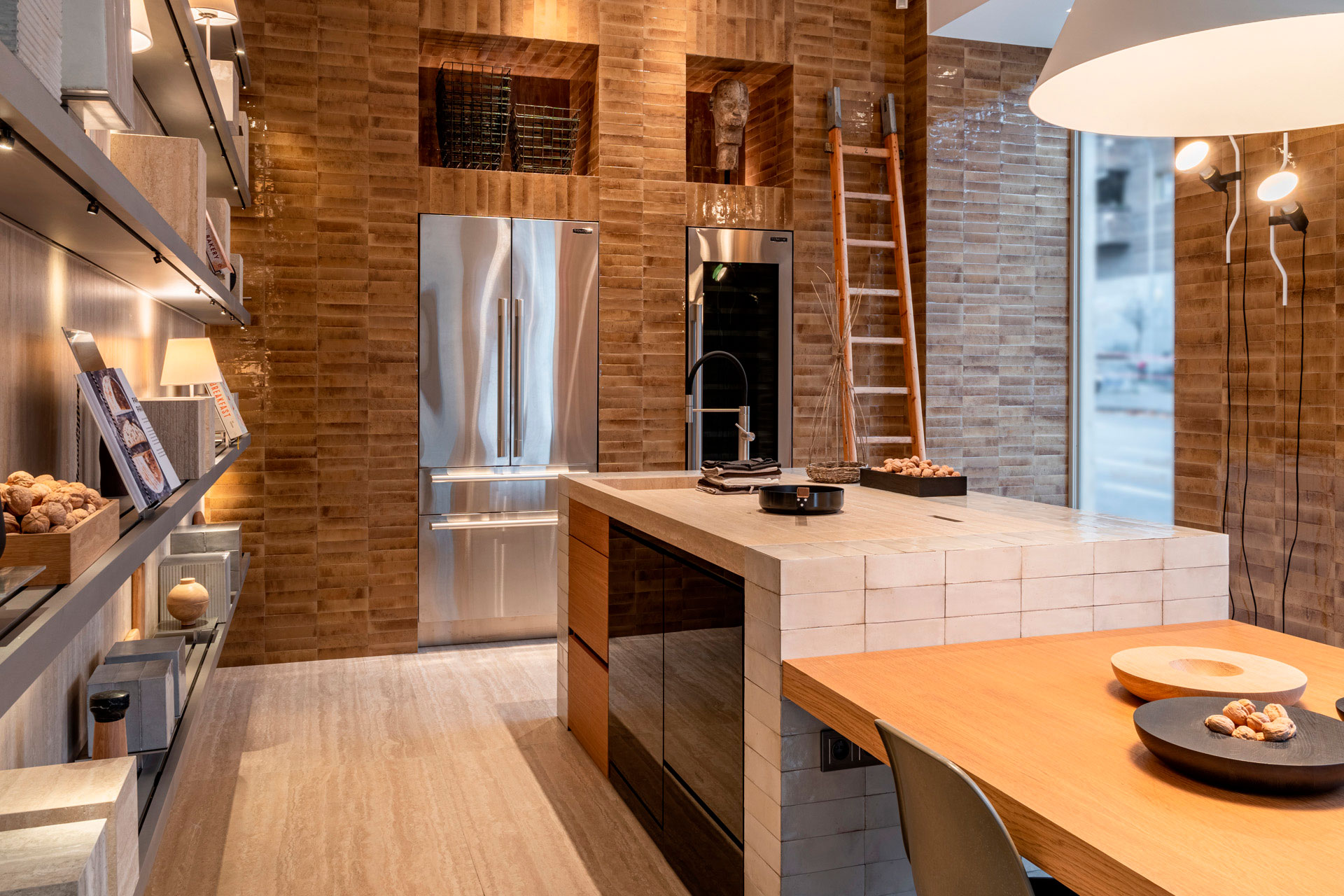 Le showroom accueille les visiteurs dans un espace convivial, The Welcoming Room, aménagé d'après le concept Living Kitchen, où la polyvalence des grandes dalles en grès et la pétillante luminescence des collections en petit format Crogiolo dialoguent en mettant en contact, tout autour de la cuisine, zones et fonctions.