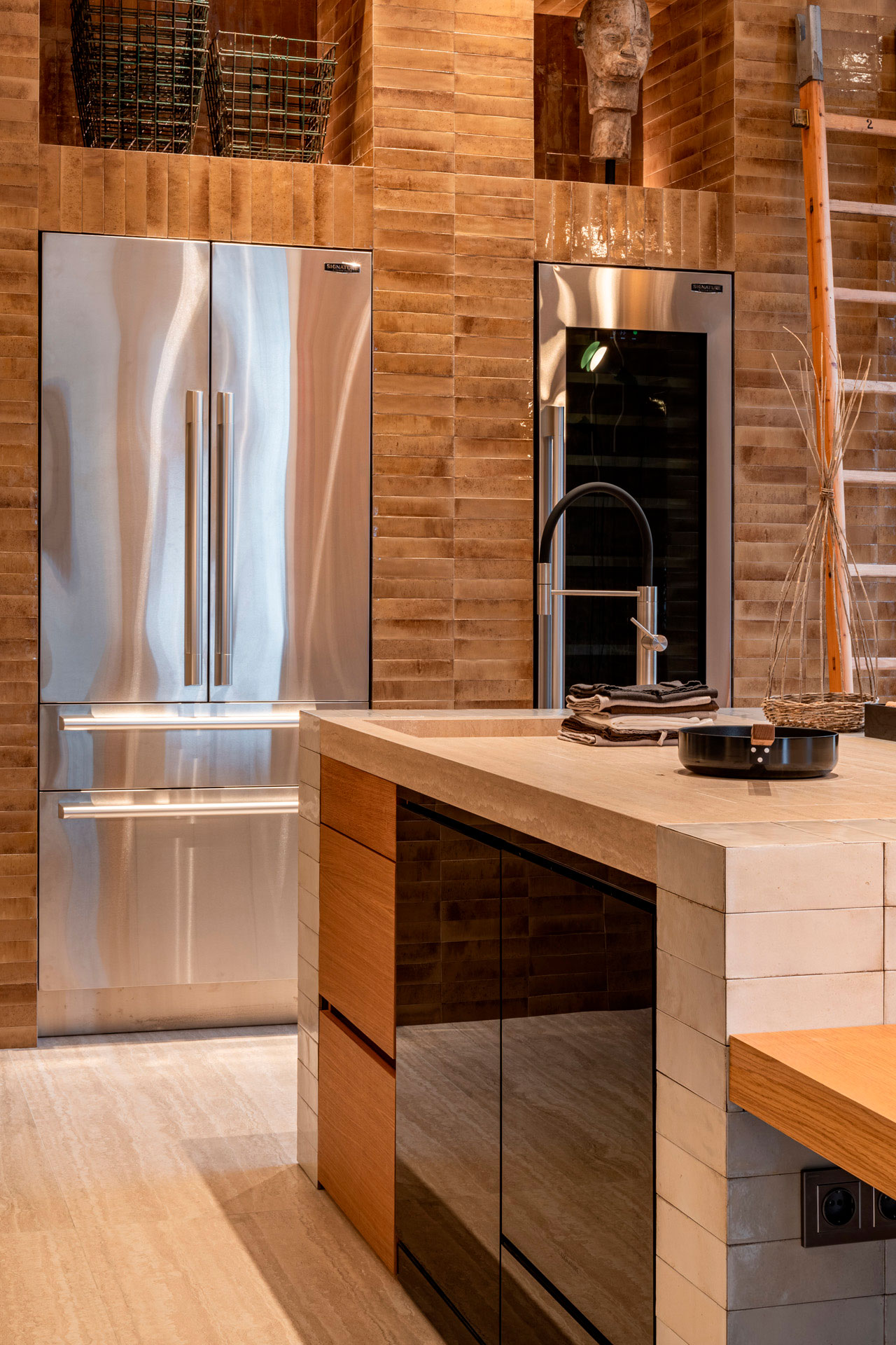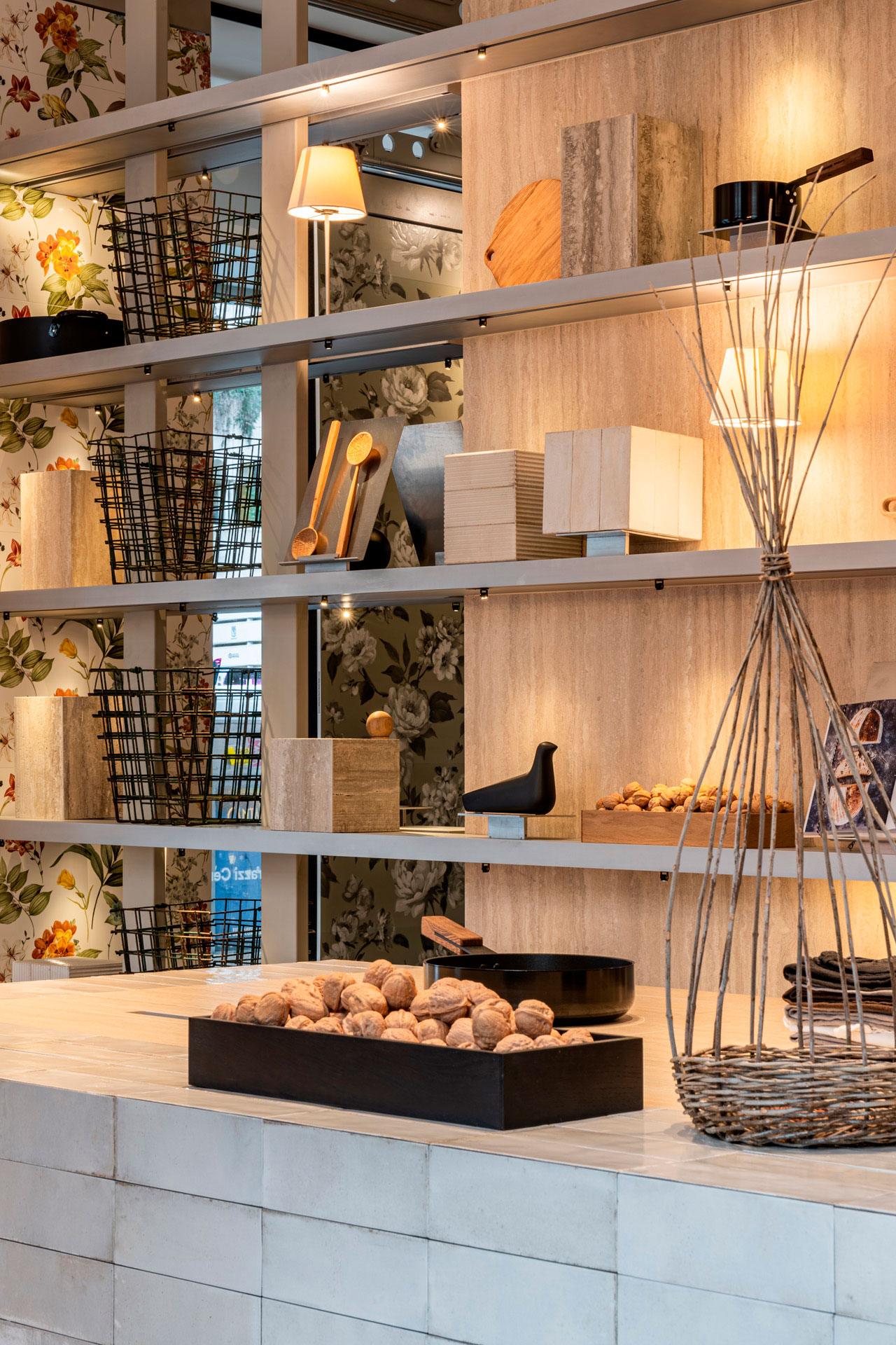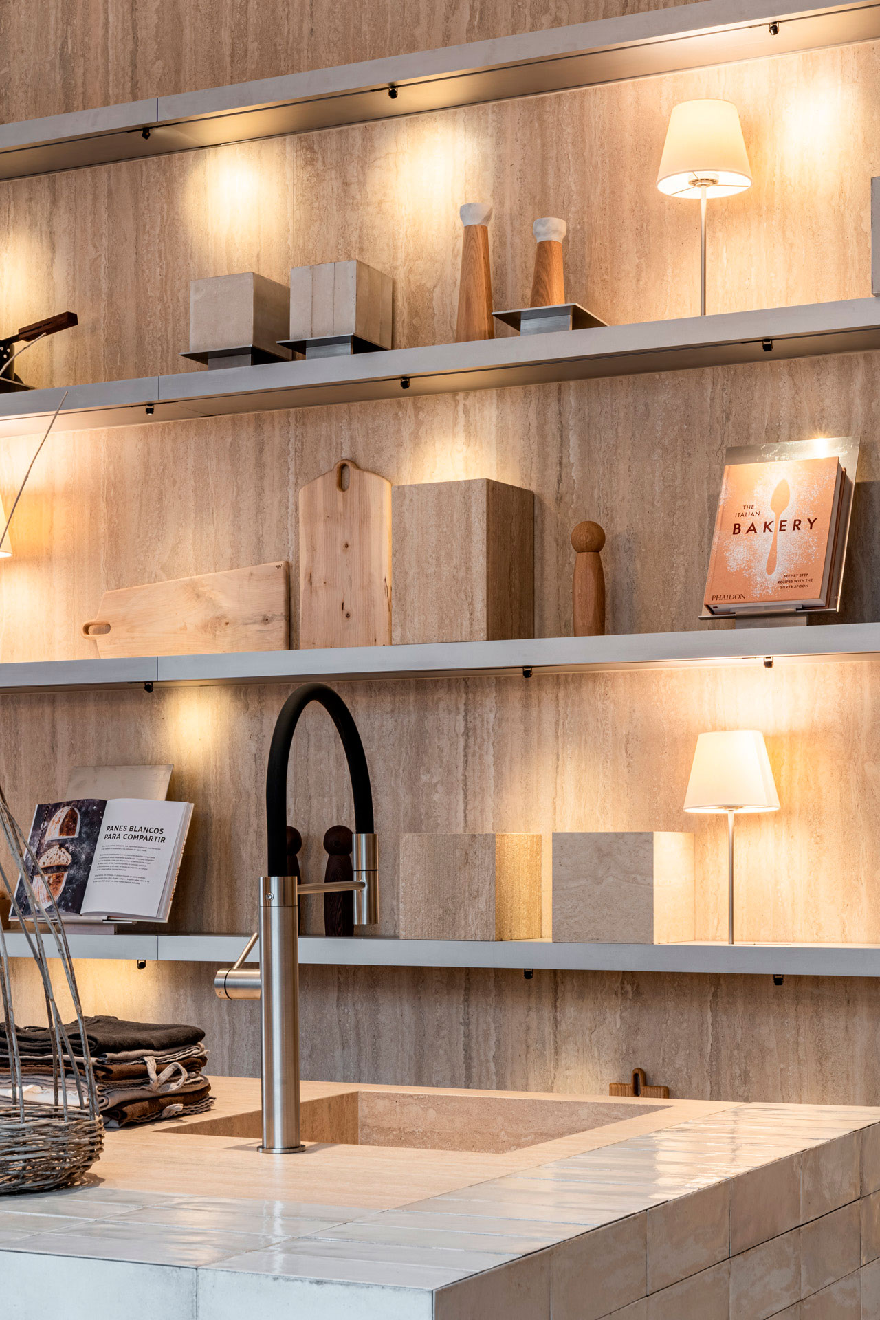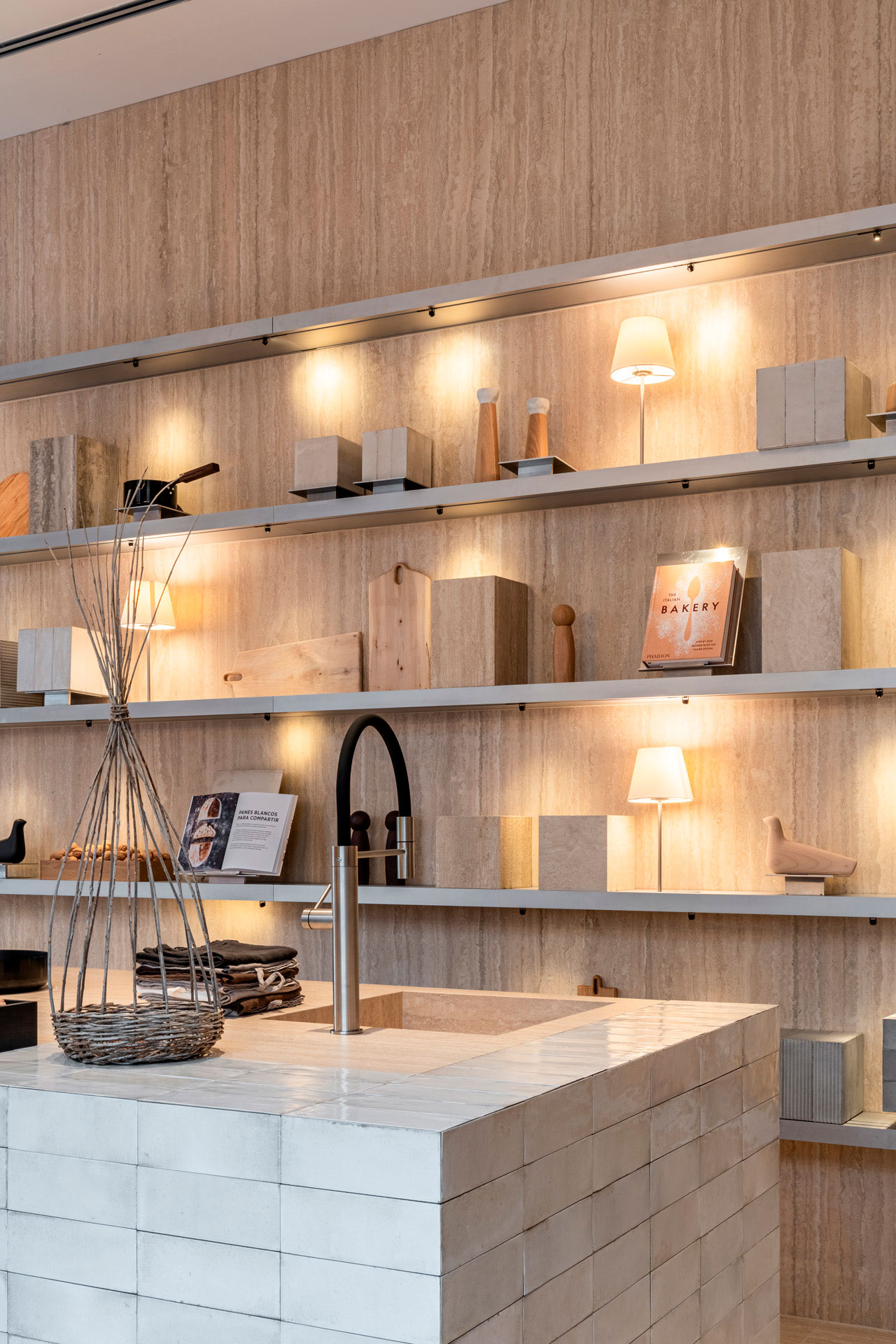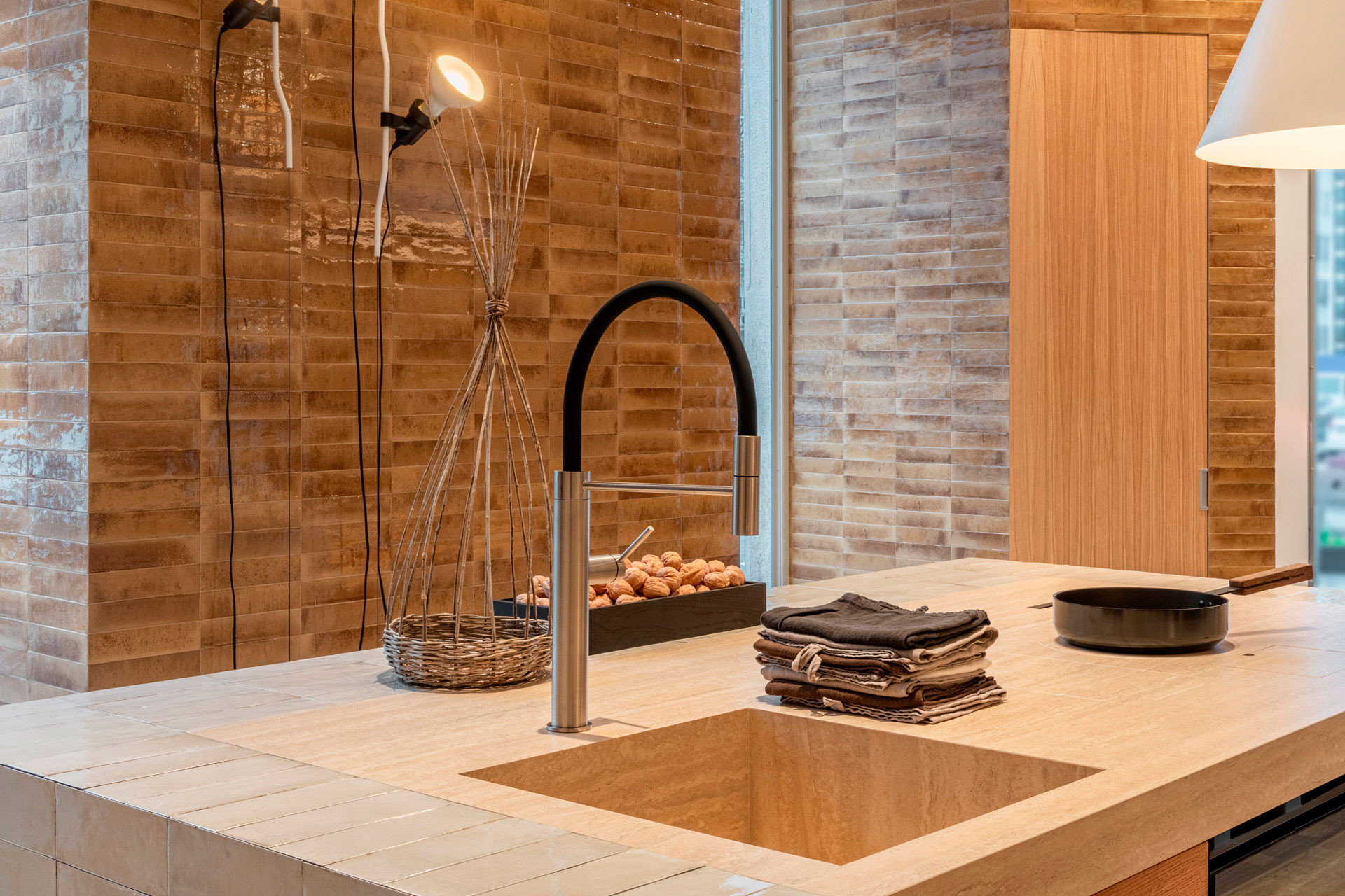 Le showroom accueille les visiteurs dans un espace convivial, The Welcoming Room, aménagé d'après le concept Living Kitchen, où la polyvalence des grandes dalles en grès et la pétillante luminescence des collections en petit format Crogiolo dialoguent en mettant en contact, tout autour de la cuisine, zones et fonctions.